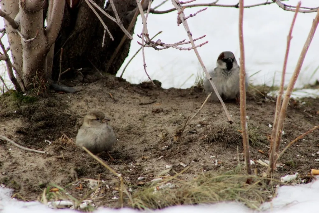 А в городе Ханты-Мансийске в проталине у дерева несколько перезимовавших домовых воробьев удобно устроились, радовались жизни и принимали песочные и солнечные ванны. Весна пришла.