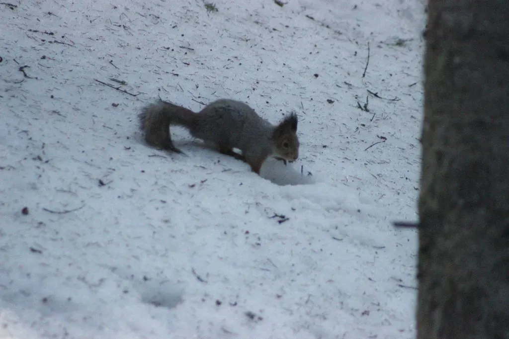 Белка, скрываясь полностью в яме, доставала сделанные с осени припасы.