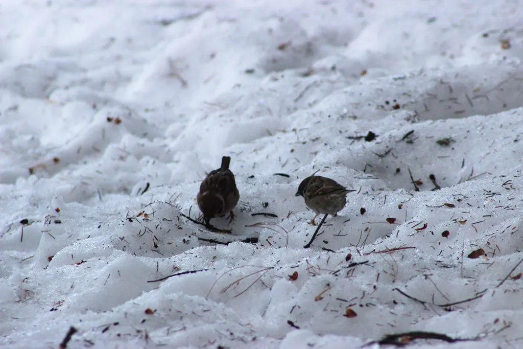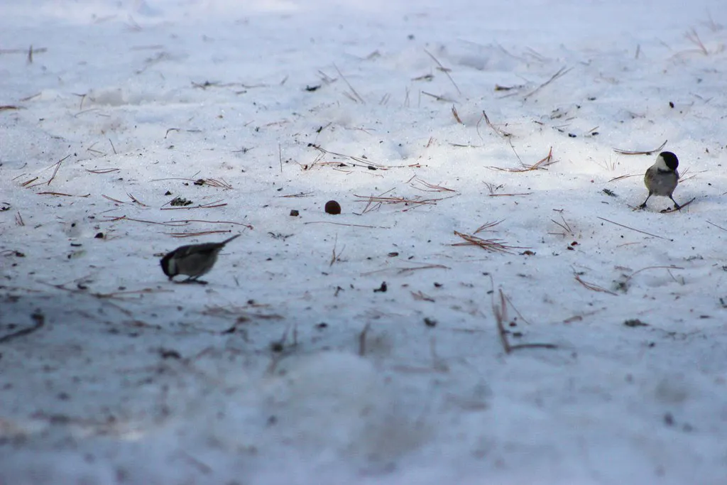 На окраине леса пара полевых воробьев деловито копошилась на снегу, один воробей что-то полезное для себя выкапывал, второй внимательно наблюдал.