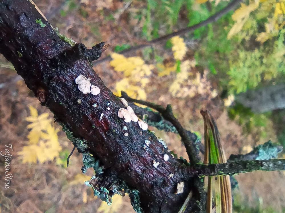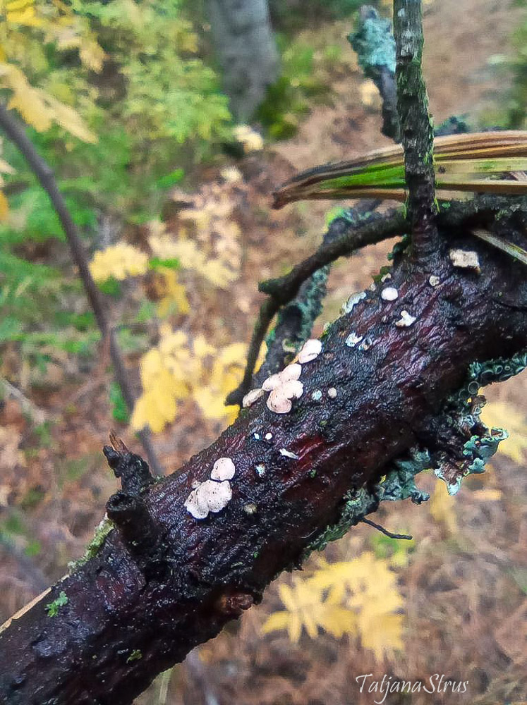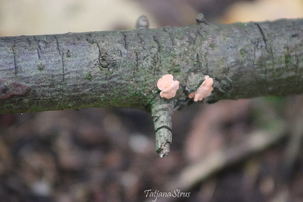Плодовые тела очень похожи на дискомицеты, прикреплённые к субстрату центральной точкой, сначала одиночные, округлые, дисковидные, подушковидные или блюдцевидные, затем сливающиеся друг с другом, 10 – 50 мм в диаметре. Край узкий, заворачивающийся вверх, беловатый, бахромчатый.