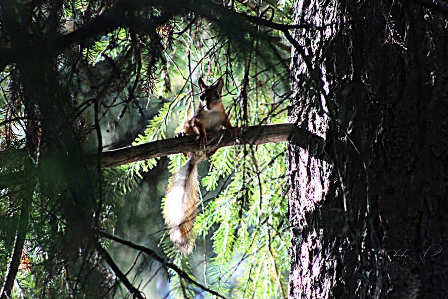 В городских лесах в августе можно увидеть совсем молодых белок обыкновенных. Которые хоть и любопытничают, цокают громко, но держатся на средней высоте крупных хвойных деревьев, затем исчезают в кронах.