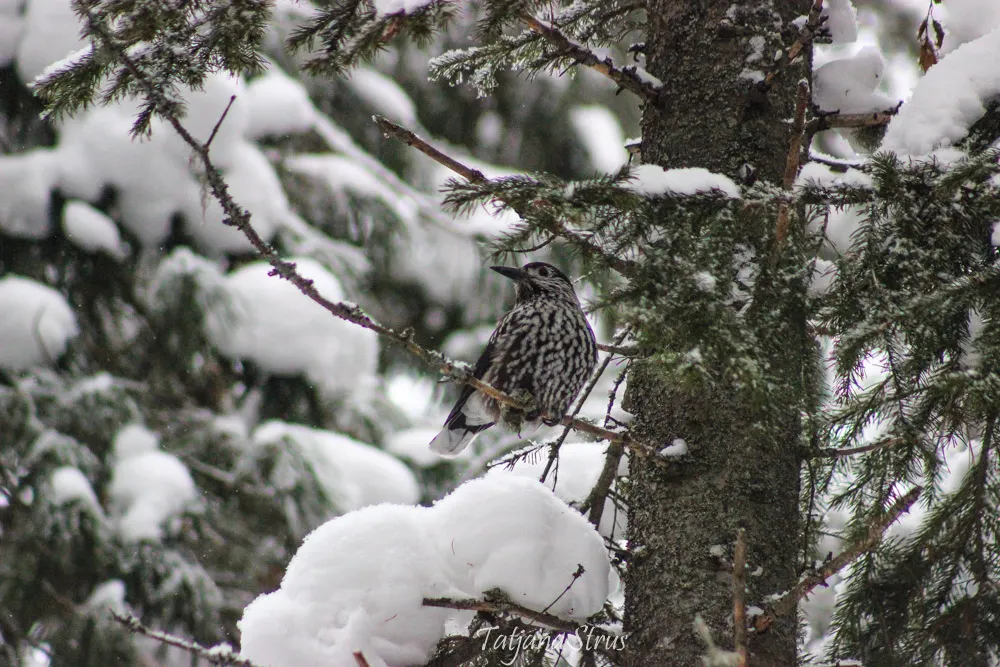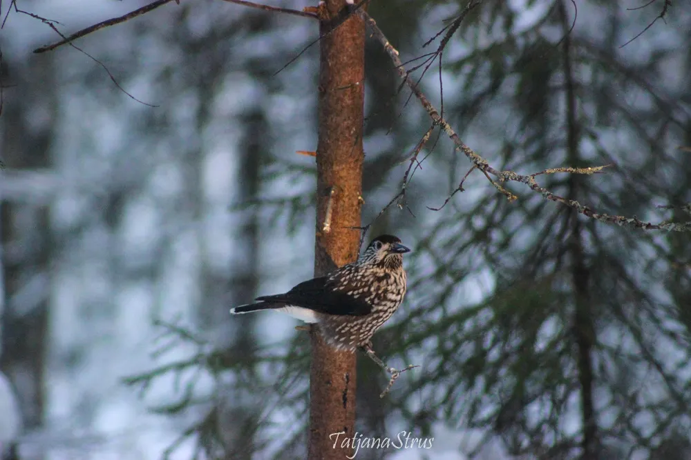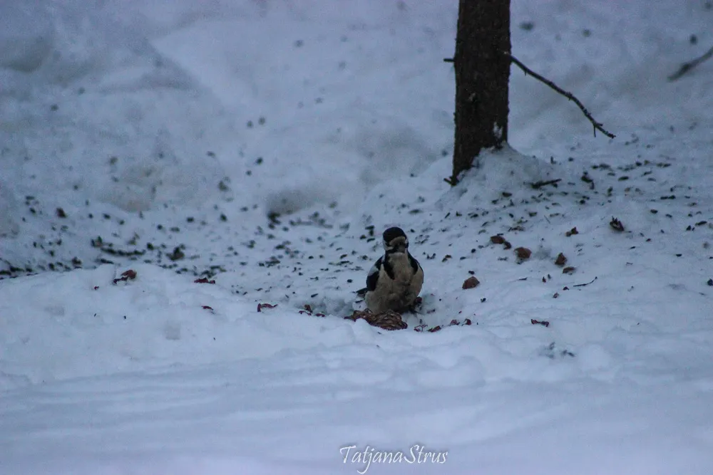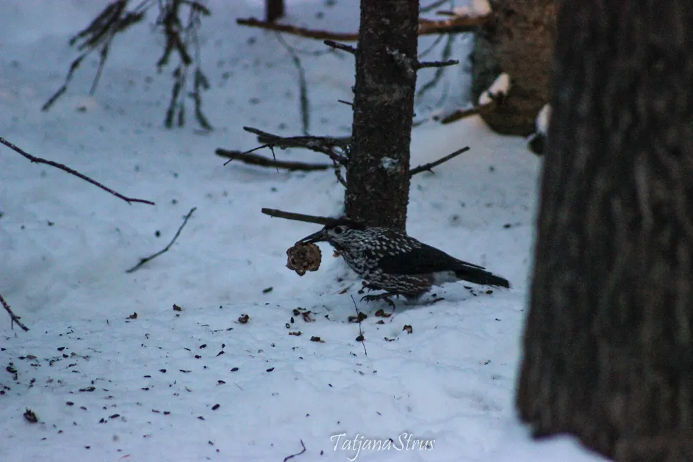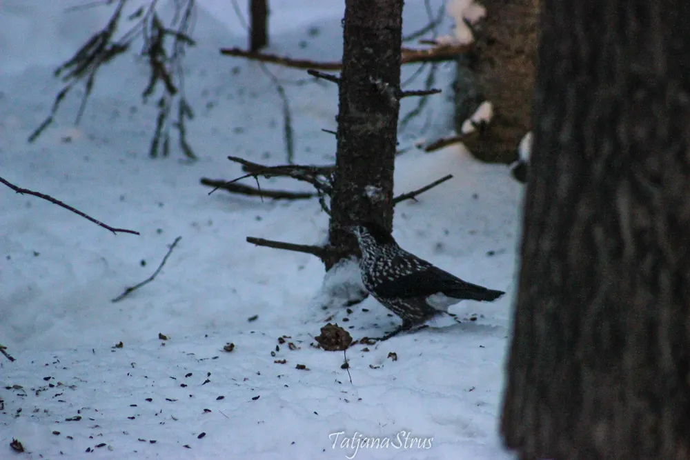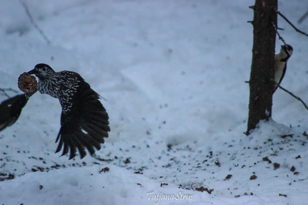 Несколько дней назад на прикормленной территории появились кедровки, которые оставляют большого пёстрого без кедровых орехов. При появлении кедровок большой пёстрый дятел улетает и скрывается среди деревьев.