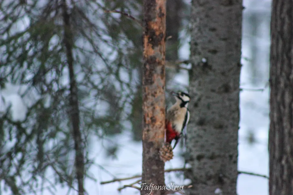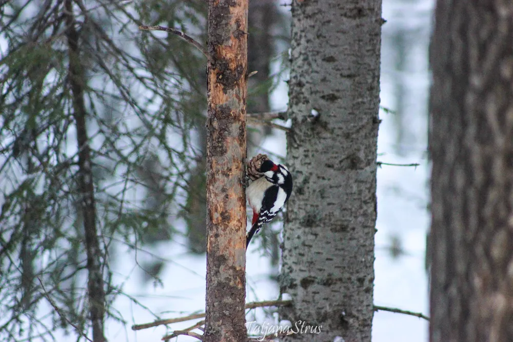 Привычно бросаем кедровые шишки на снег возле кормушки, через несколько минут появляется дятел и, бочком, скрываясь за стволами деревьев, прыжками передвигается к шишками и начинает доставать орех. Взяв в клюв несет орех в расщелину (кузницу) и расщепив скорлупу достает ядро. Сразу же возвращается за вторым орехом.