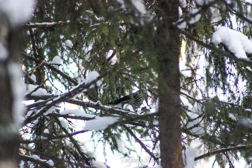 Появилась наблюдательница — кедровка и, схватив кедровую шишку, поднялась с ней и исчезла среди ветвей.