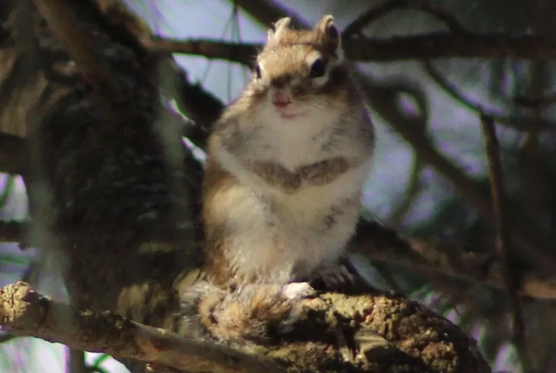 И, чтобы лучше видеть меня, один из бурундуков забрался на пенёк.