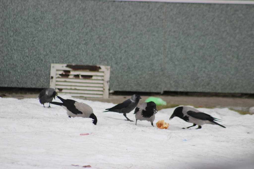 Галок, рядом с серыми воронами, можно видеть на мусорных контейнерах, среди делящих кусок найденного хлеба.