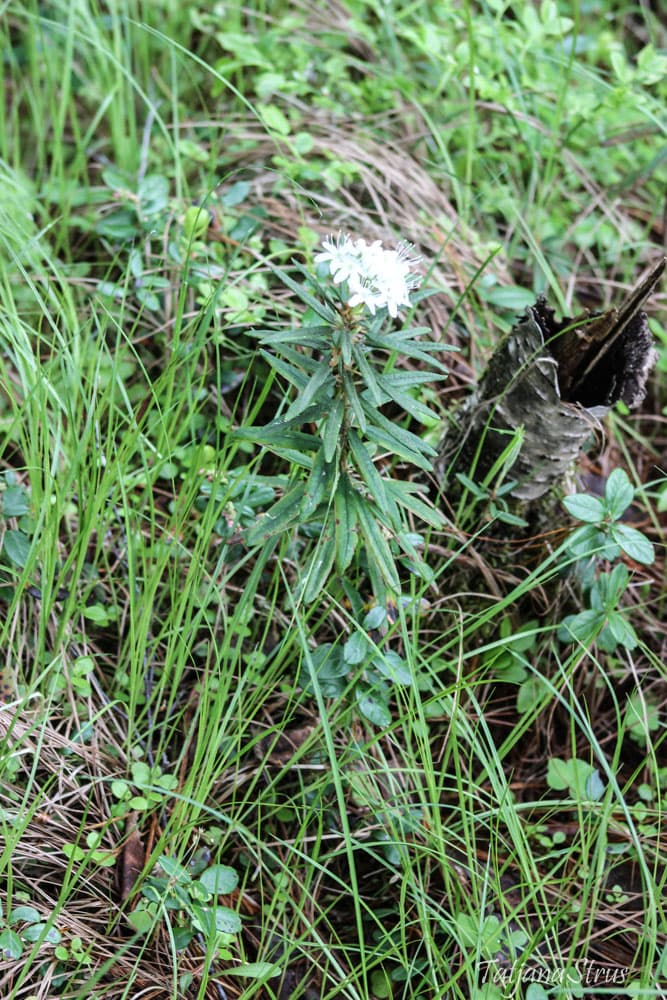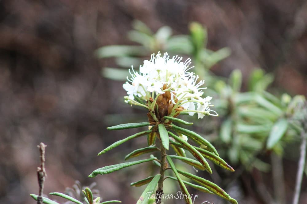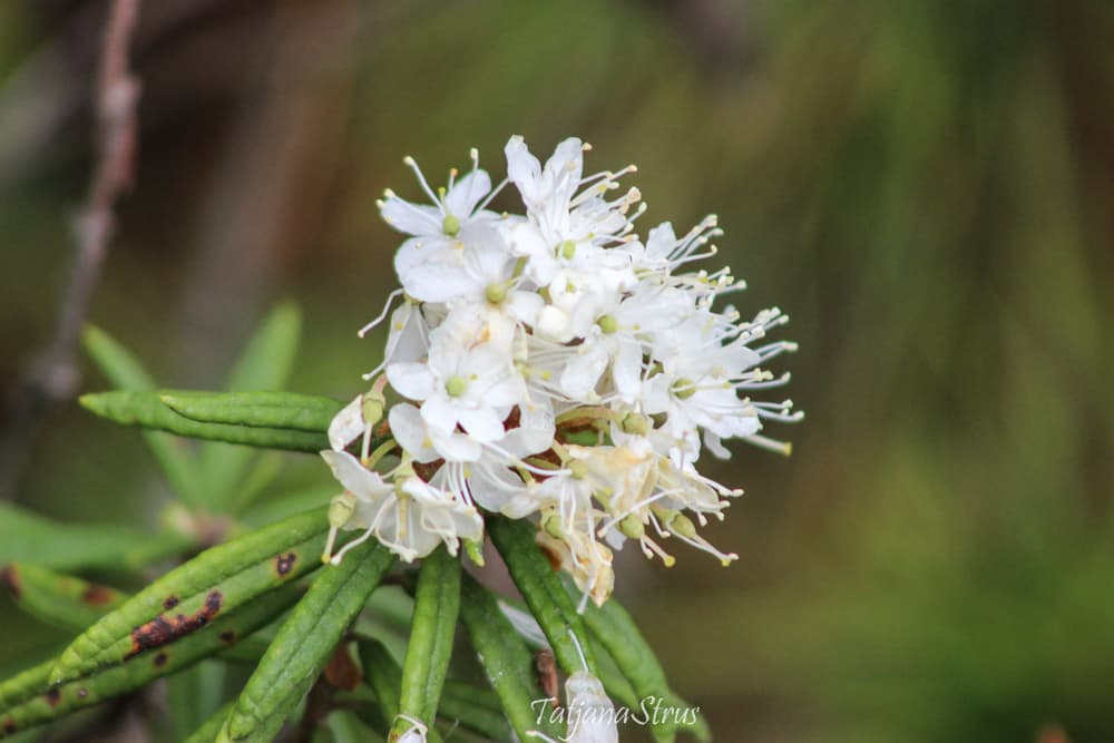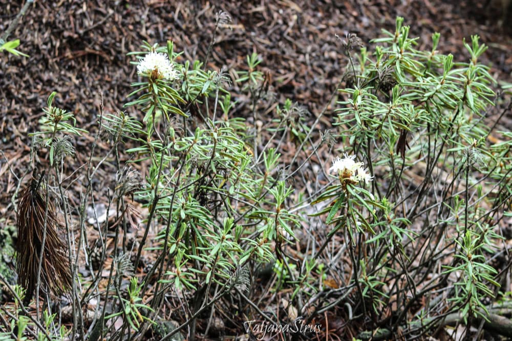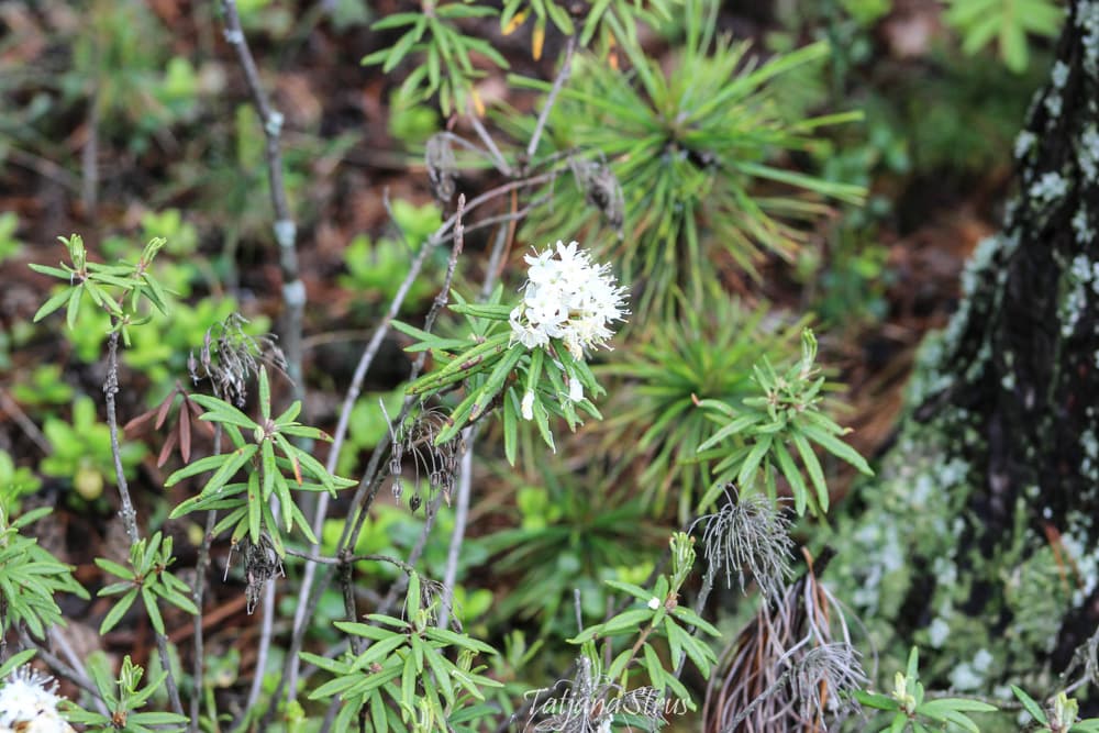 Цветы багульника болотного красивые, белые, с сильным одуряющим запахом. За этот запах багульник иногда называют «болиголов».