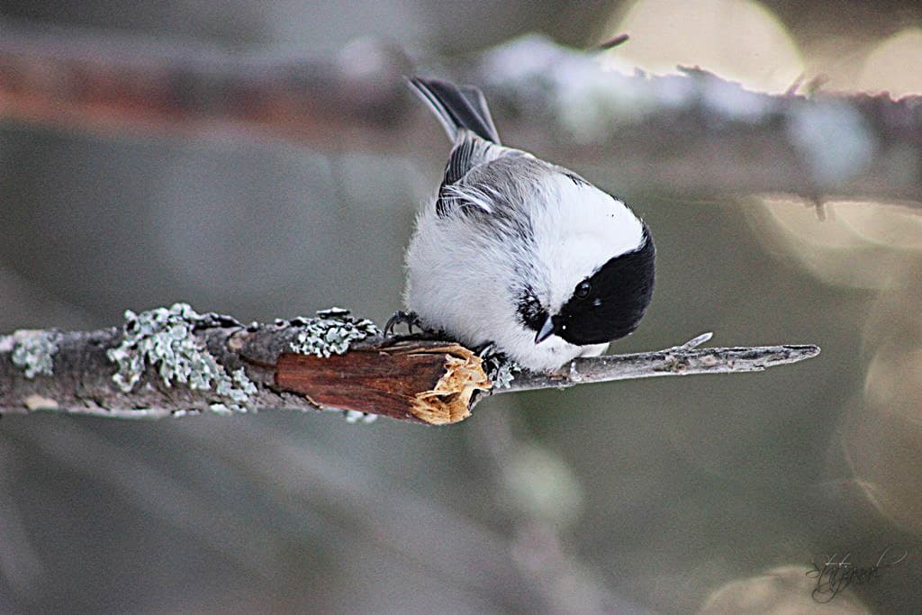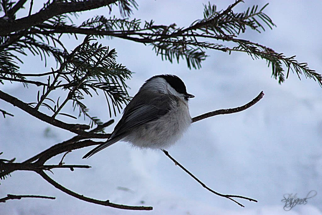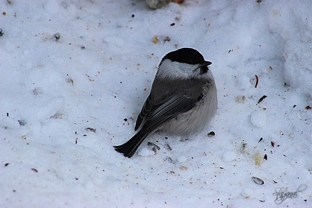 Буроголовая гаичка, разглядев упавшие семена на снегу, спикировала вниз, схватила корм.