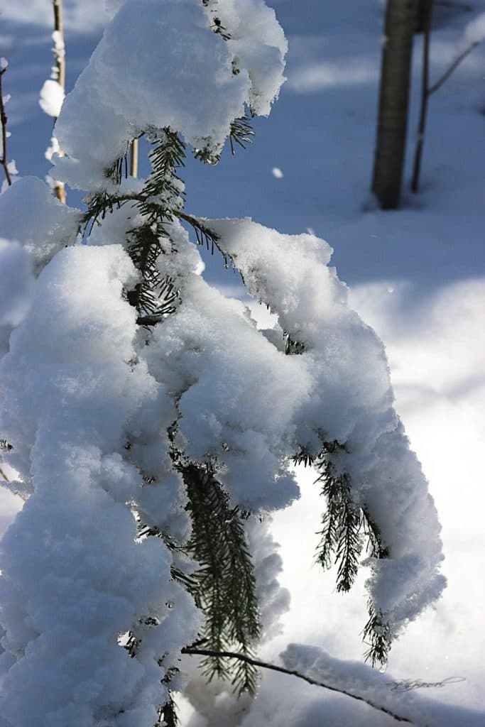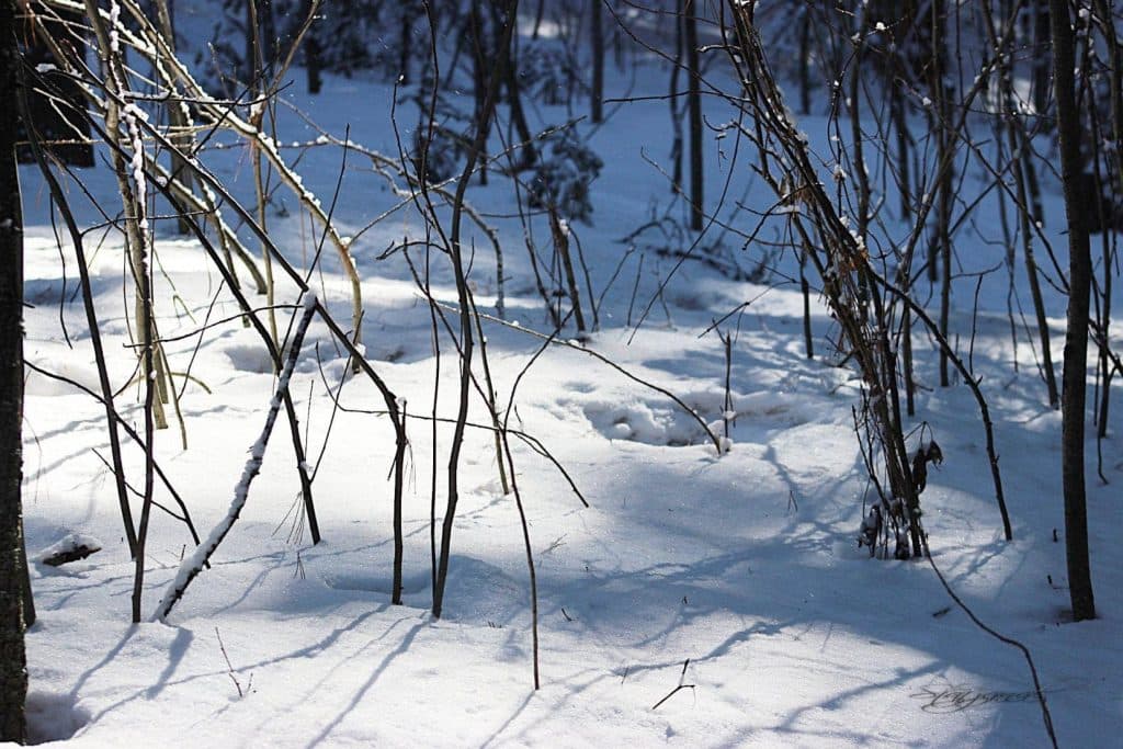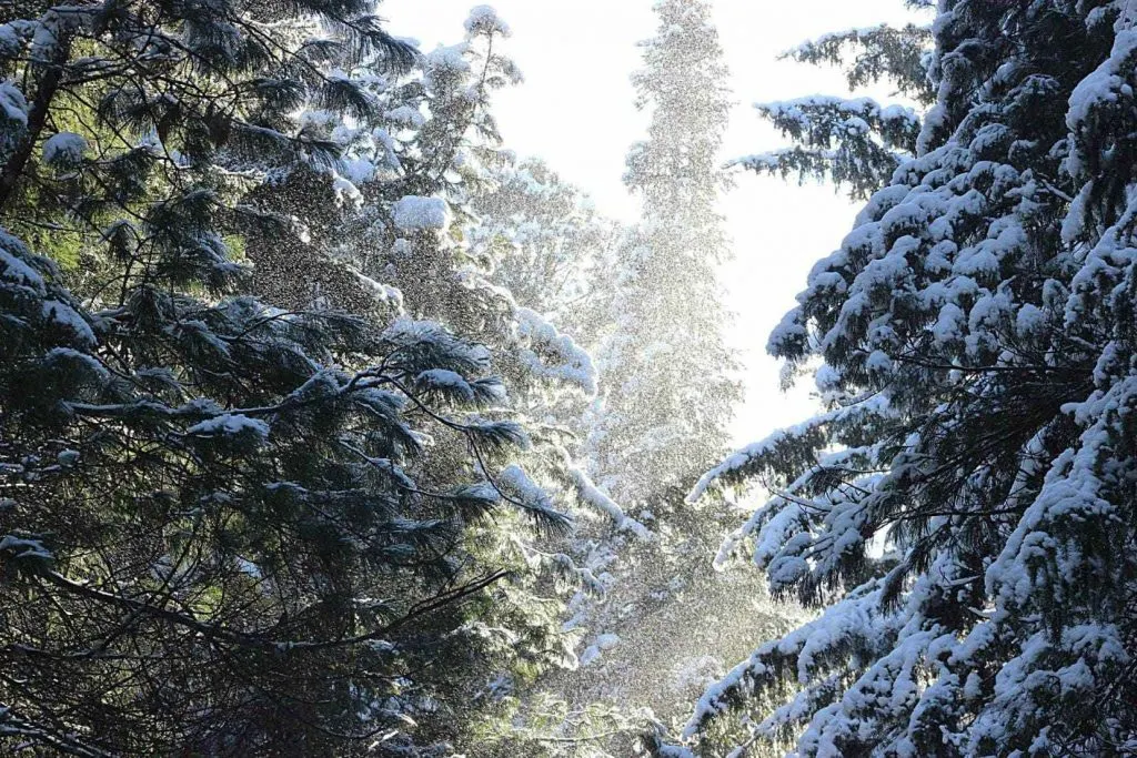 Порывистый ветер сдувал снег с верхушек деревьев и тогда в лесу начиналось падение снежных шапок и завихрение снежинок.