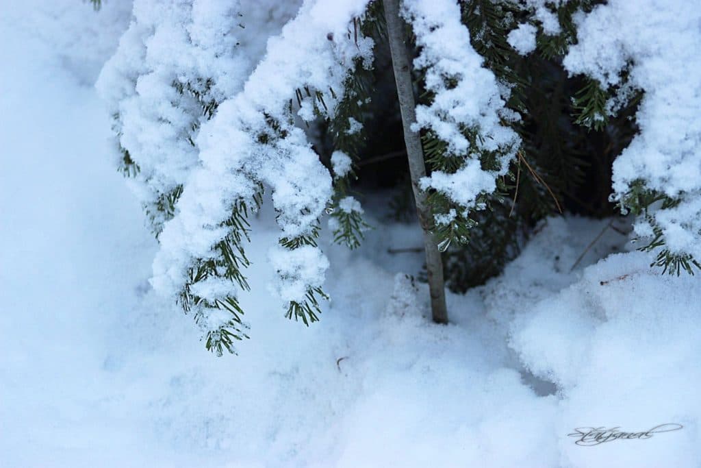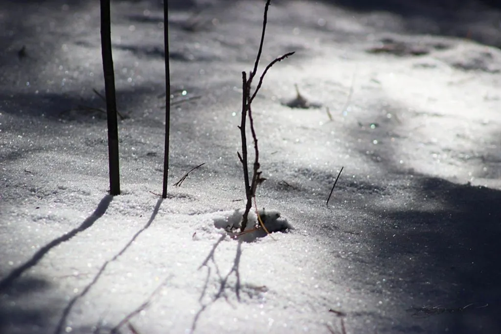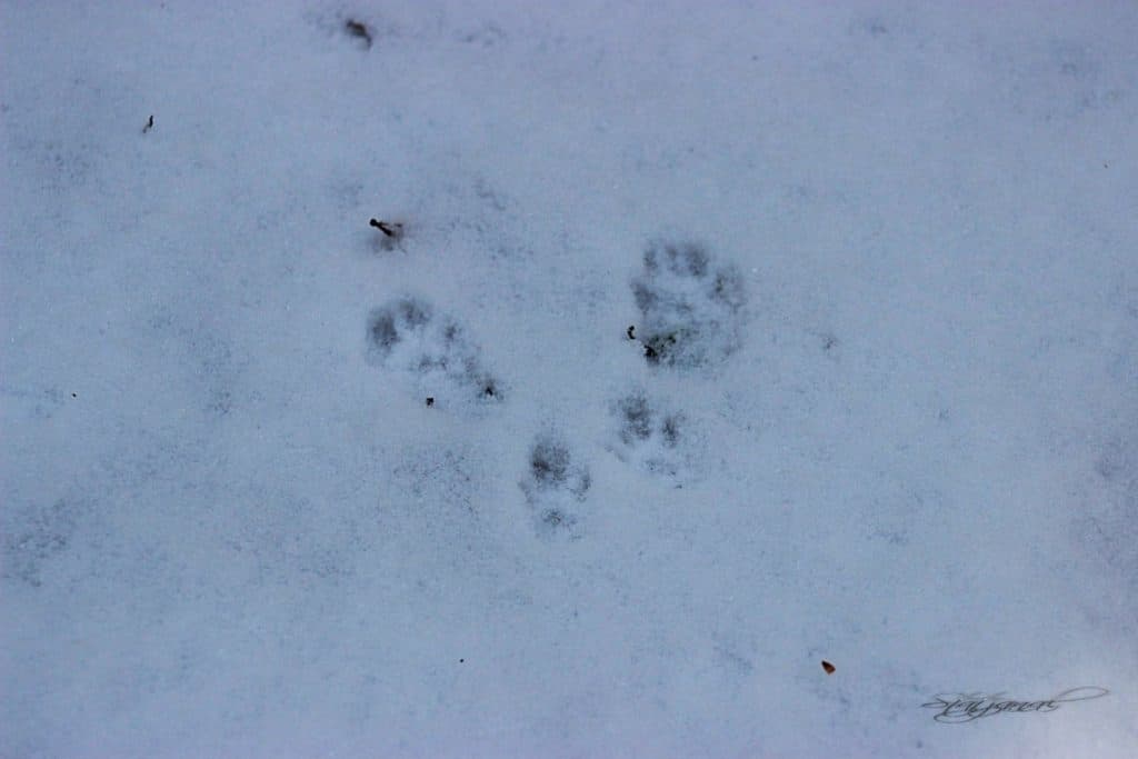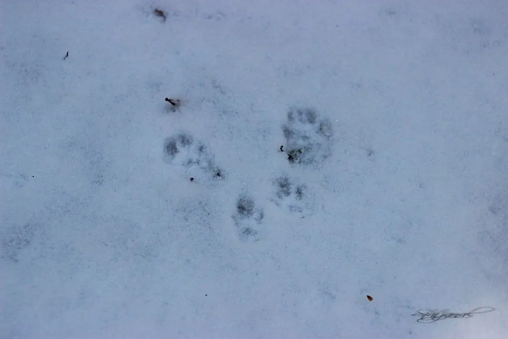 На твёрдую корку на снегу после короткой оттепели (наст) выпала пороша и четко обозначились следы животных. Здесь тропинку пересекла белка, оставив четкие отпечатки, задние конечности заметно длиннее передних. Пальцы с цепкими острыми когтями.