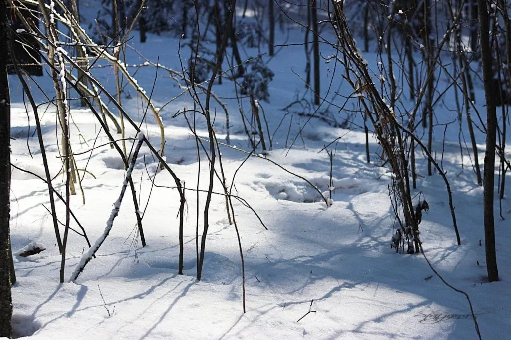 Полуденное мартовское солнце светит ярко, снег блестит на свету. От деревьев на снегу протянулись длинные сиреневые тени.