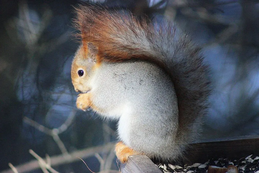 А вот и белка обыкновенная, сидит на кормушке, грызёт хлебные сухарики.
