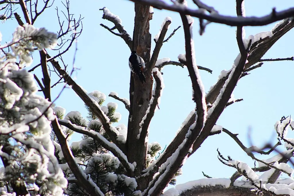 Равномерный стук на вершине дерева услышан и отыскан взглядом создатель шума, им оказался большой пестрый дятел, отыскивающий насекомых в древесине.