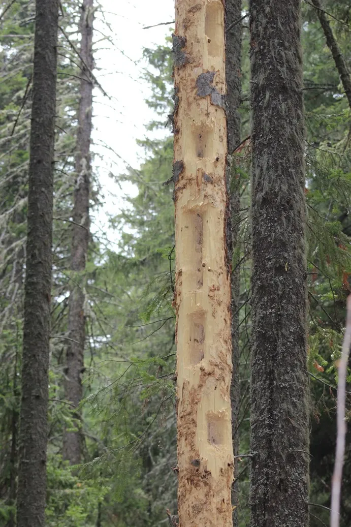 Чтобы получше рассмотреть дерево, искусно обработанное дятлом, было сделано несколько фотографий. Обычно можно встретить дерево с одним — тремя прямоугольными отверстиями, сделанным дятлом. Поэтому при виде дерева с более чем 20 отверстиями, не проходишь мимо, а удивлённо его осматриваешь.