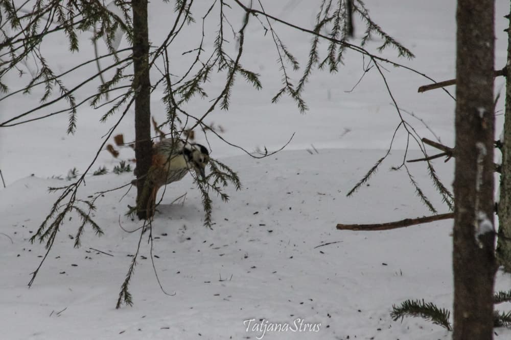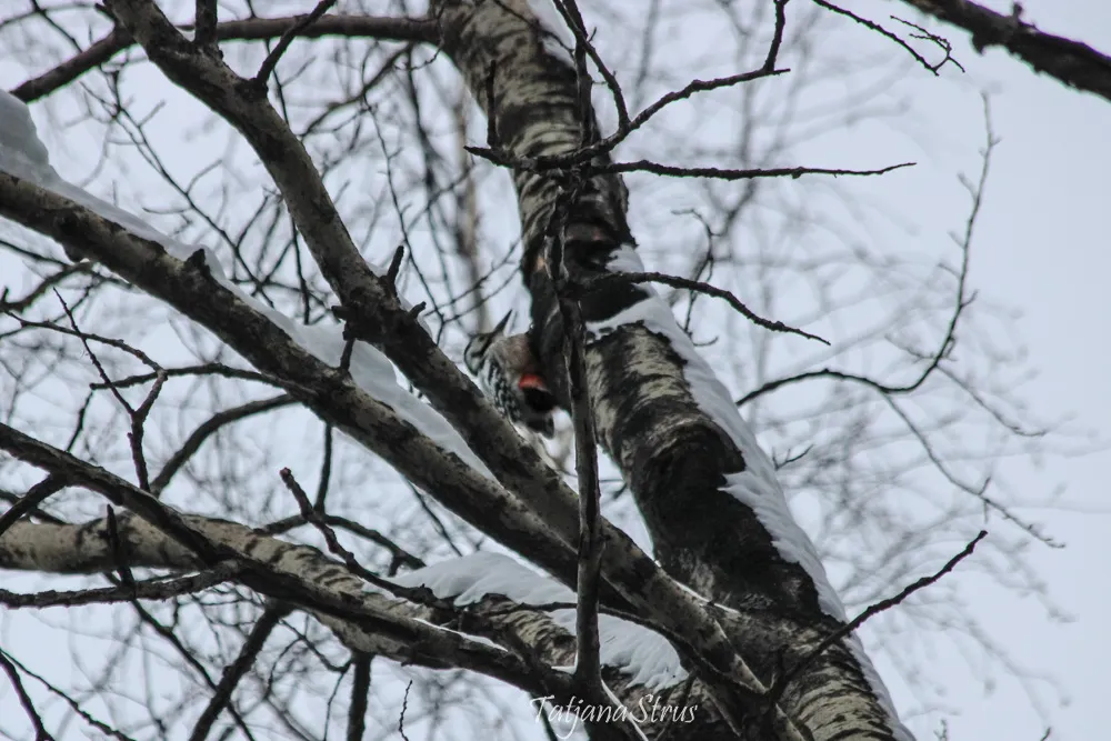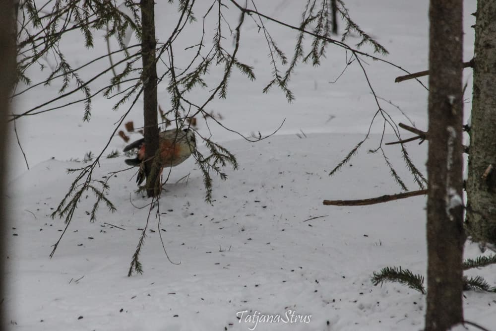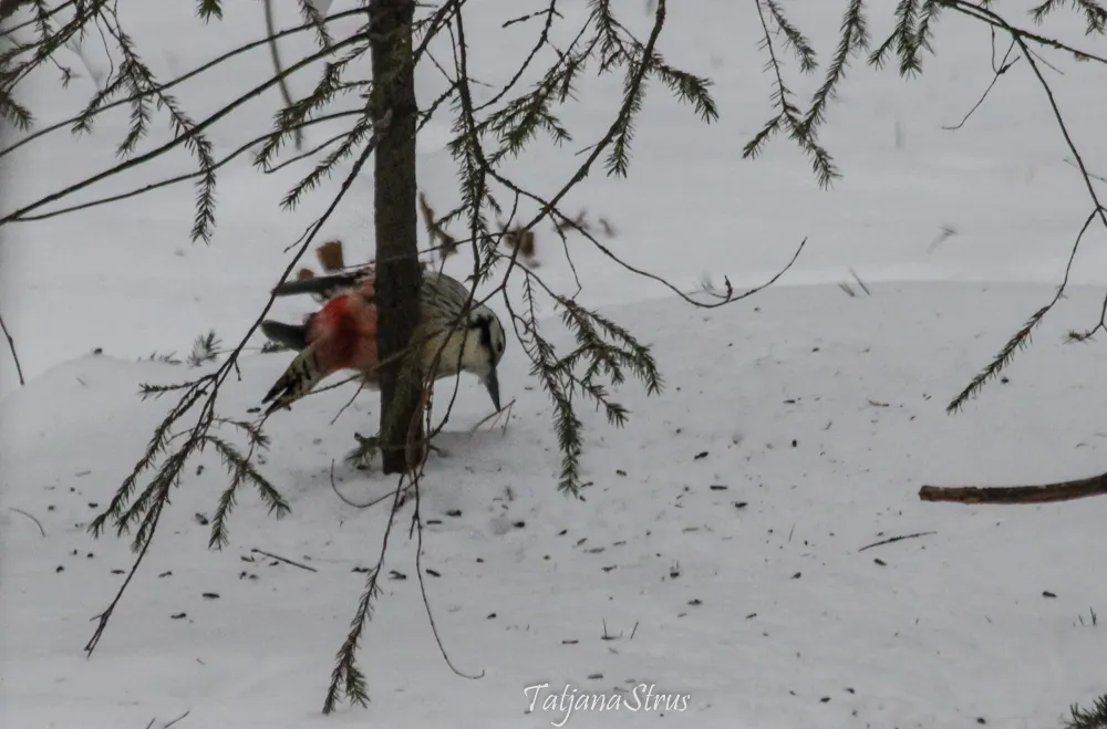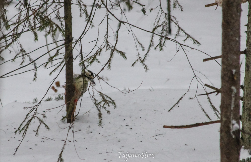 Ещё на подходе к месту кормления, заметили сидящего в кормушке белоспинного дятла, кормящегося семенами подсолнуха. Завидев нас, дятел отлетает недалеко, но сразу же возвращается и принимается за прерванный завтрак.