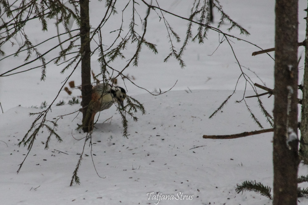 С начала периода наступления подкормки лесных птиц белоспинный дятел не появлялся у кормушки, установленной в лесу и, только, сегодня удалось увидеть его в месте кормления.
