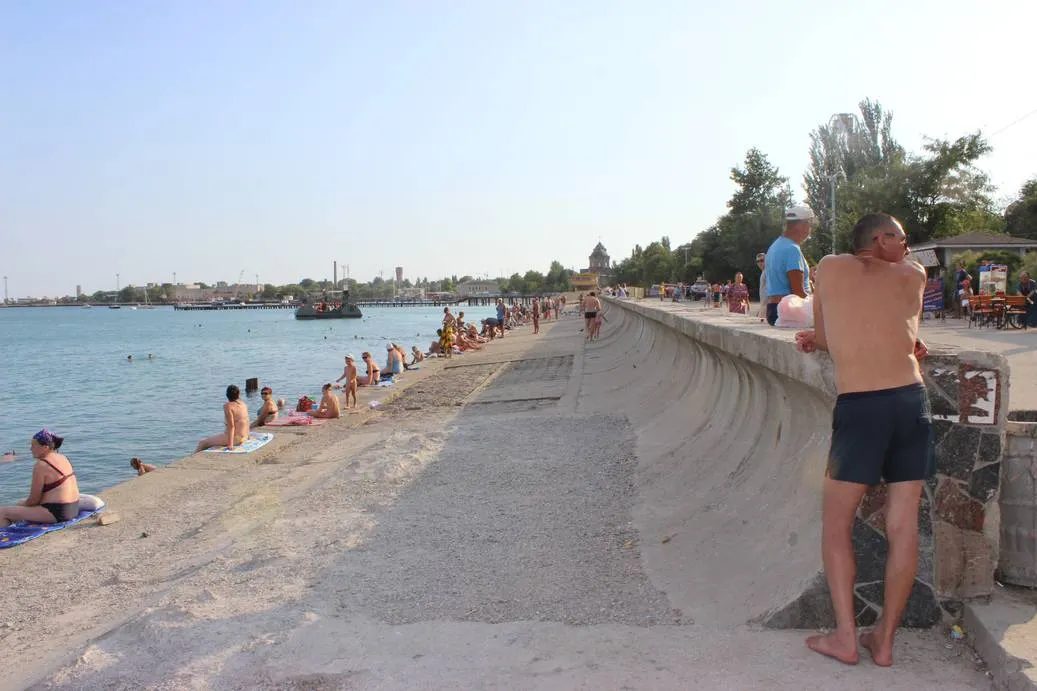 Набережные Евпатории. Кто-то купается и загорает на набережной им. Горького, она протянулась на 800 м вдоль береговой линии. С запада к ней примыкает оконечность Парка им. Фрунзе, с востока – Стена Керкинитиды.