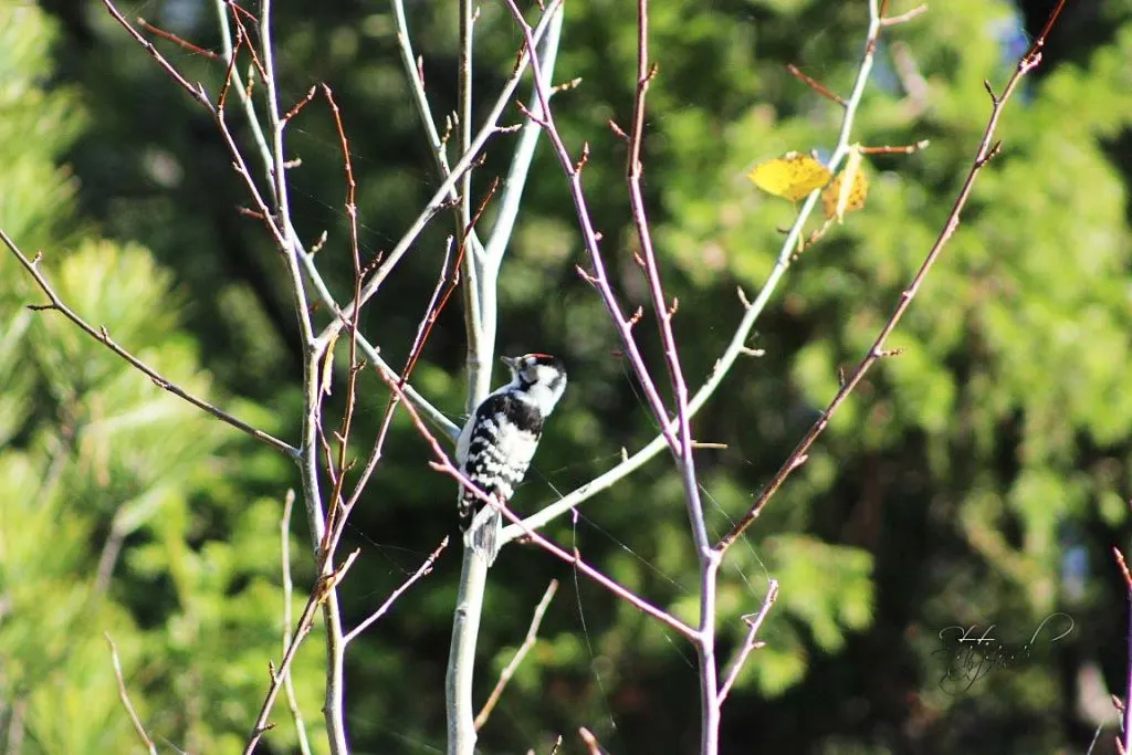 Малый пестрый дятел облетает свой участок и выстукивает деревья на предмет затаившегося здесь корма.