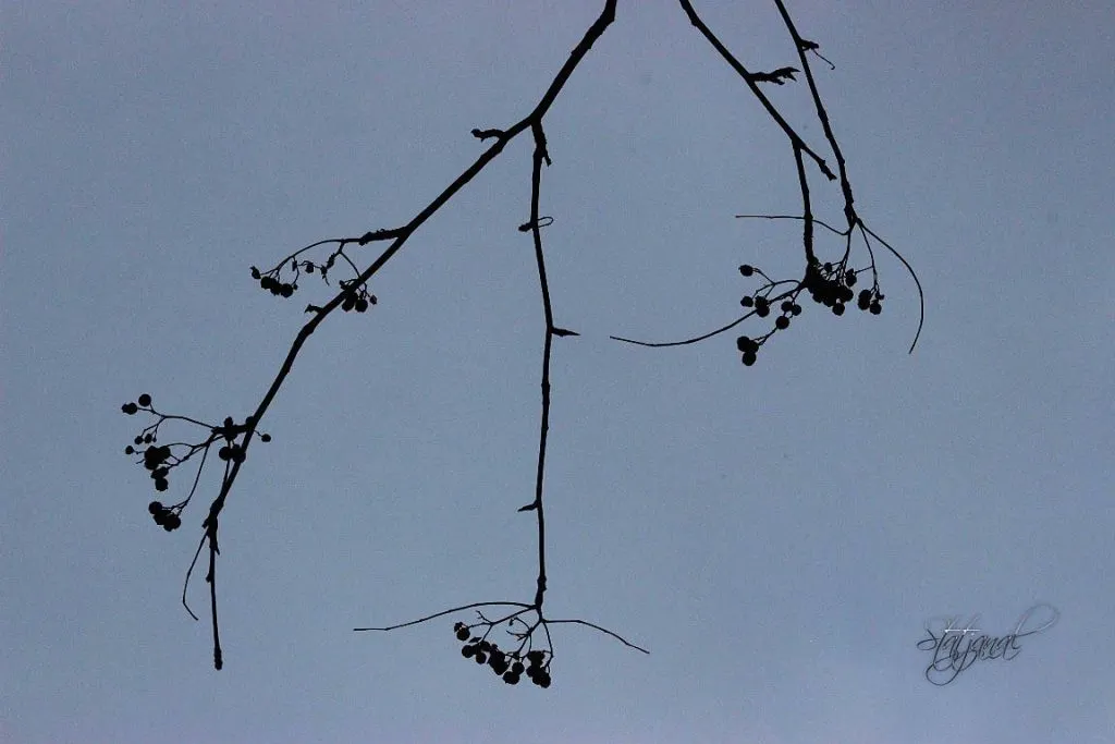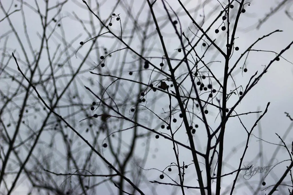 Опавшая листва обнажила свои плоды — ягоды. Отдельные ягоды черёмухи могут долгое время держатся на ветке.