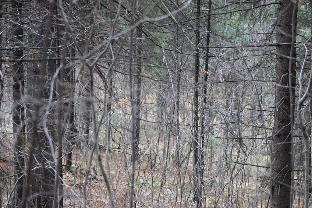 В таёжной чаще листопад уже прошел и ветки деревьев образовали своеобразный хаотичный узор.