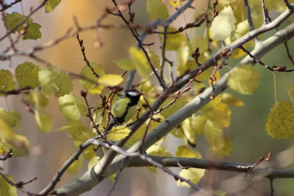 Среди оставшейся листвы видна большая синица, которая выискивает на дереве насекомых и мелких беспозвоночных.