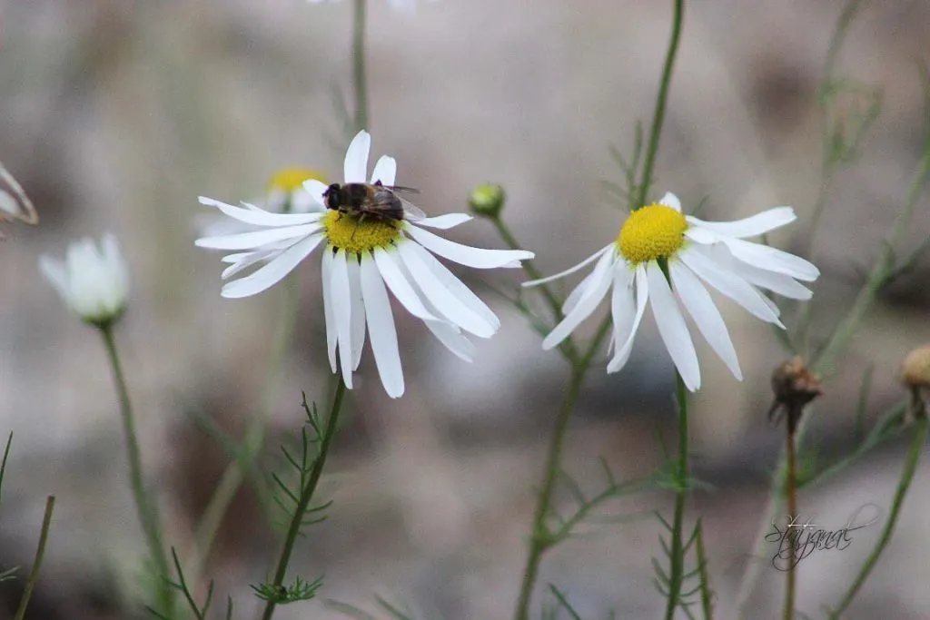 Цветёт ромашка лекарственная или аптечная. На желтом цветоложе корзинки кормится журчалка.