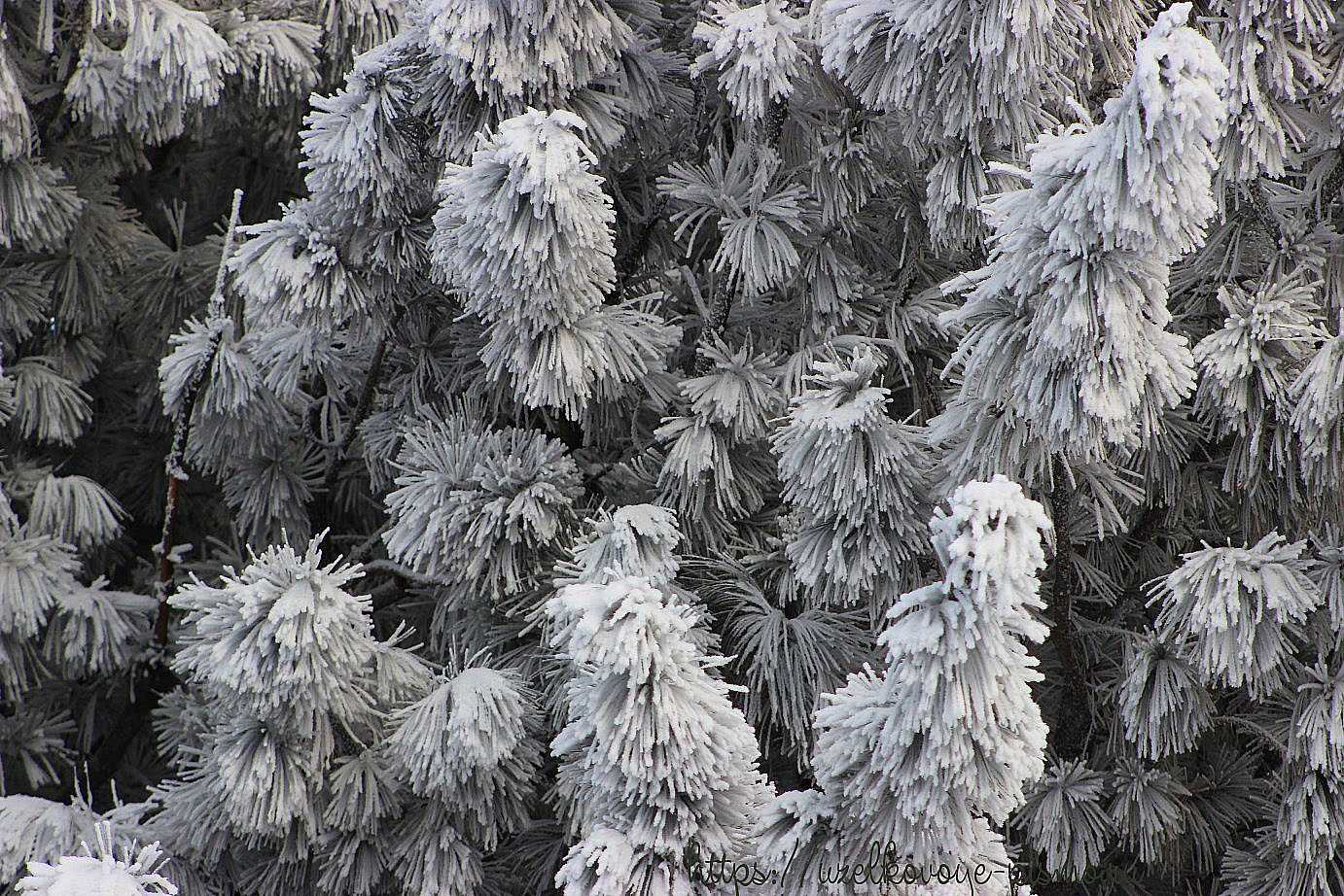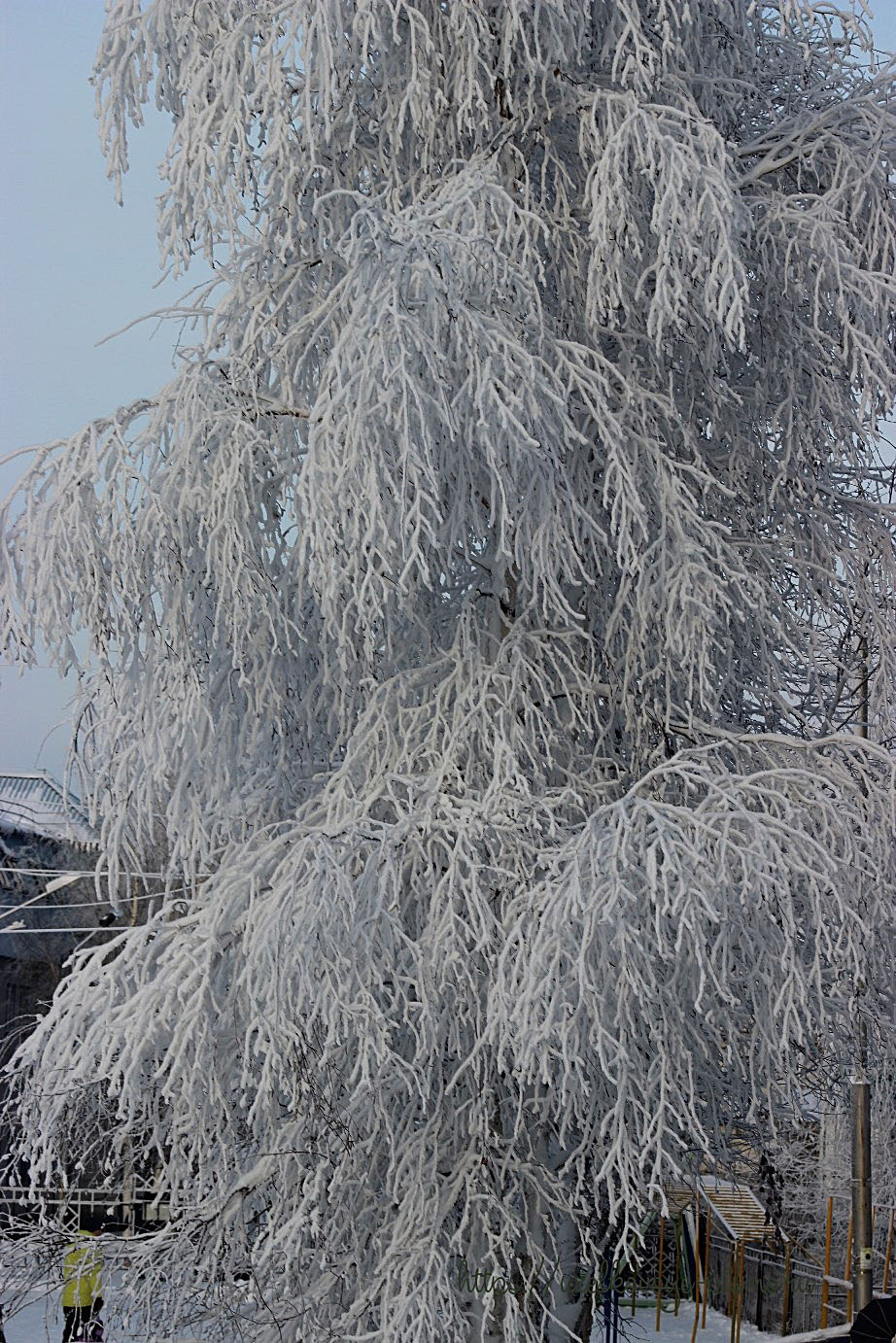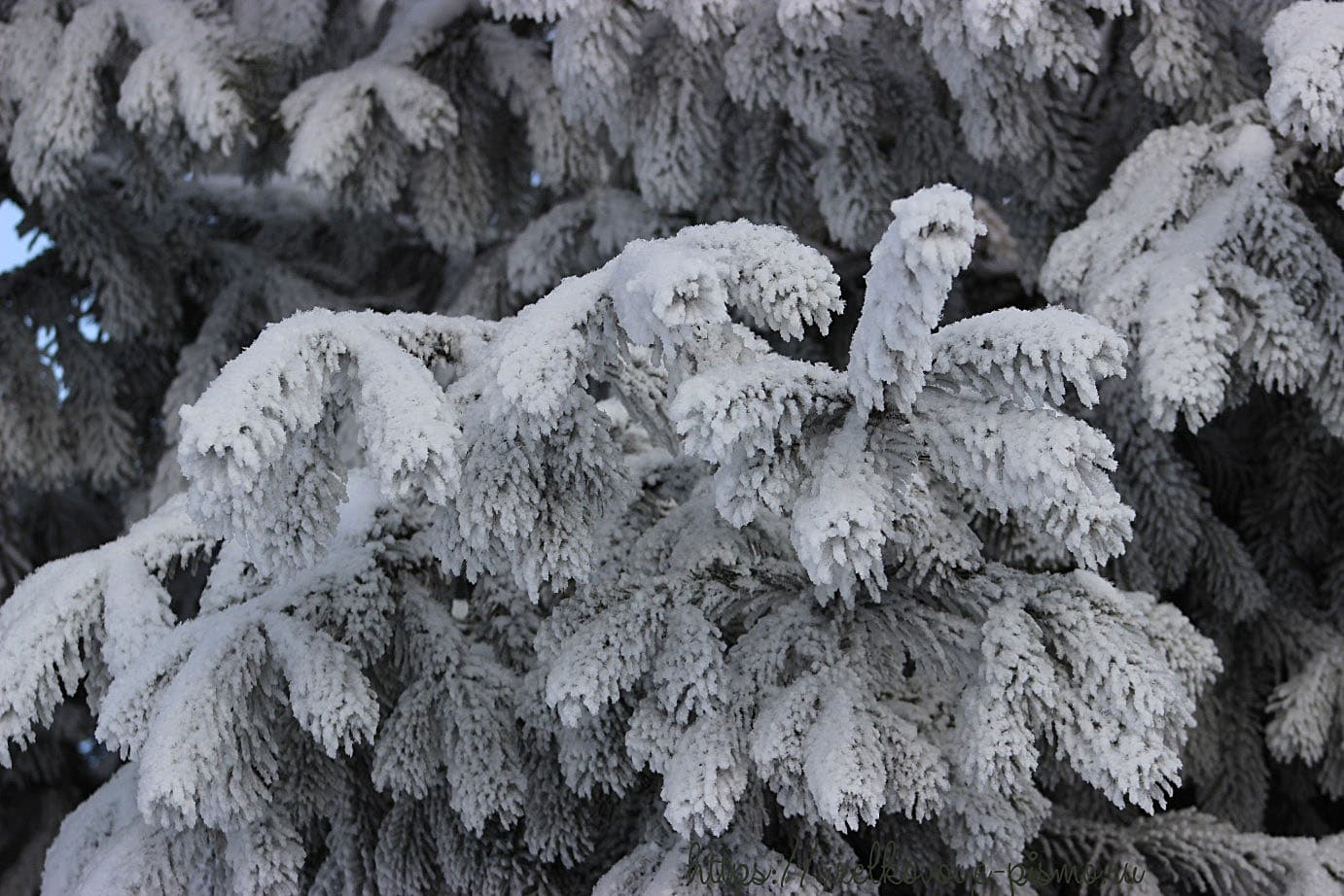 На ветвях и сучьях деревьев из за  морозной туманной погоды  появилась изморозь.  Изморозь на сосне кедровой.   Изморозь — отложения ледяных кристаллов, которые появляются в солнечные морозные дни при высокой влажности воздуха.
