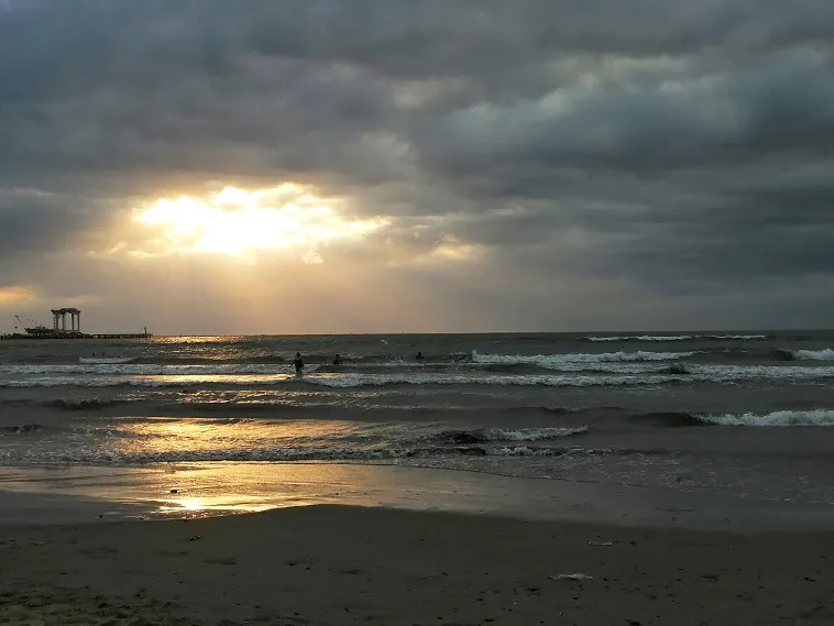 В конце сентября в Анапе начались прохладные, солнечные дни, вперемежку с дождями, дули порывистые ветры, температура воды опустилась до +20°. Купающихся в море смельчаков немного, в основном, отдыхающие сидели на берегу под слабыми лучами солнца, на ветру. В шторм пляжи отавались пустынными. Только рыбаки с удочками сутками рыбачили с пристани.