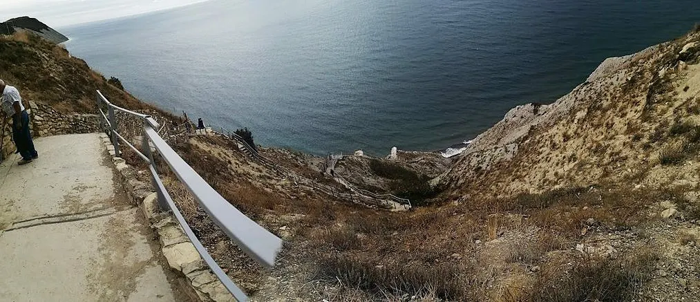 К морю можно спуститься по обустроенной серпантинной пешеходной тропе, состоящей из 800 ступеней.