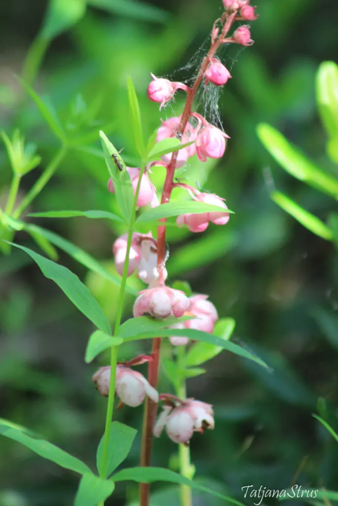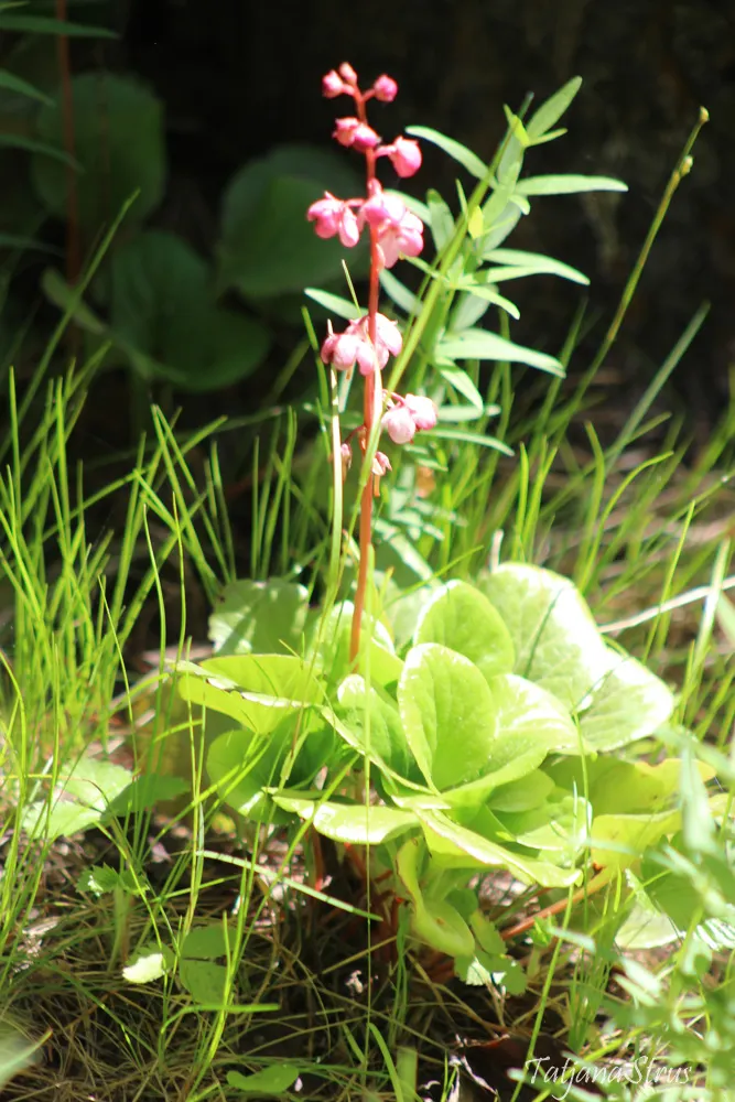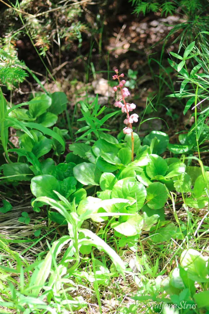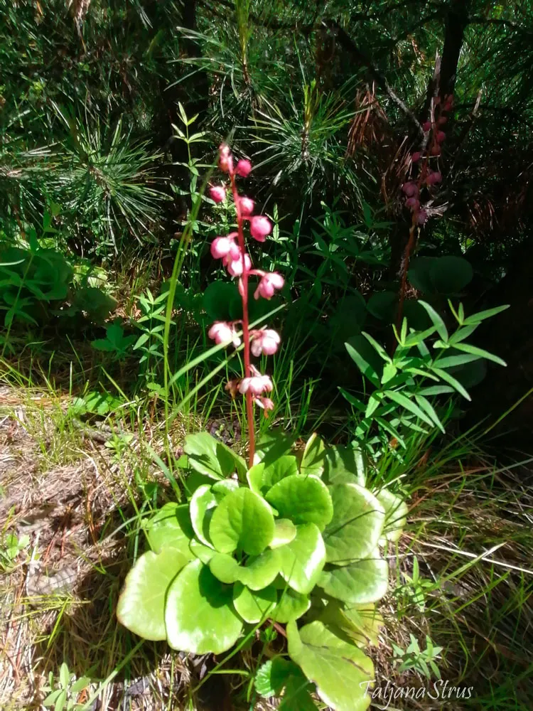 Грушанка мясо-красная (Pyrola asarifolia ssp. incarnata), семейства Вересковые, растет в зеленомошных и травяных хвойных и хвойно-лиственных лесах. Многолетнее травянистое растение, стебли которого достигают 35-40 см высотой с ярко-красными цветами и красным стеблем, ярко-зелёными кожистыми листьями.