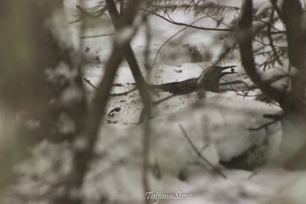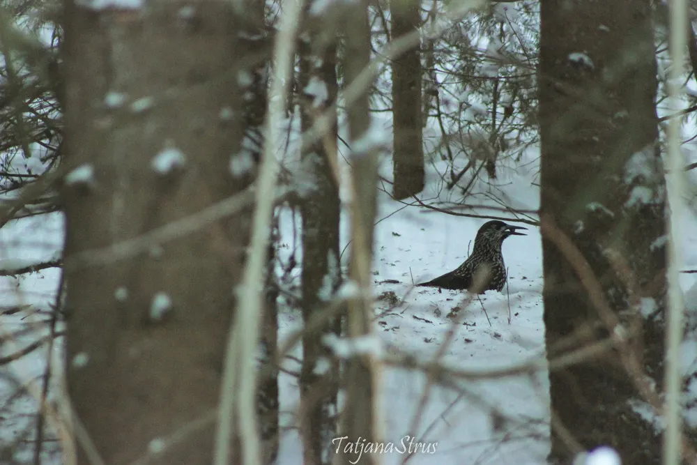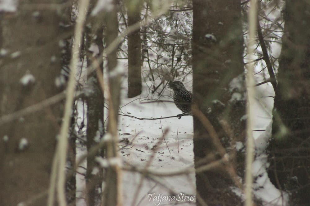 Nucifraga caryocatactes — зимующая птица. Летом и зимой можно видеть в лесу, раскапывающую лесную почву в поисках пропитания.