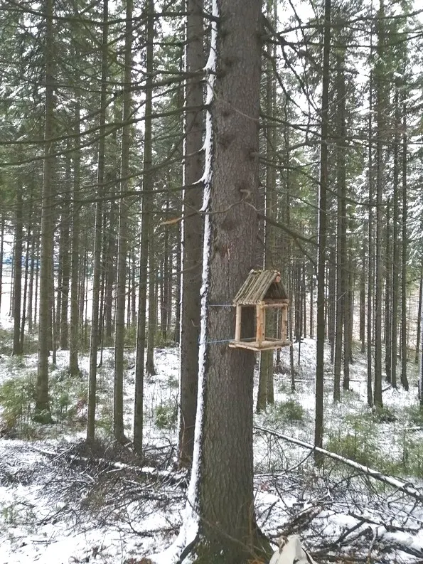 Кормушку для птиц установили в небольшом лесном массиве. Цвет кормушки, изготовленной из лесных материалов, позволяет быть незаметной и гармонично вписываться в лесной ландшафт, не изменяя его.
