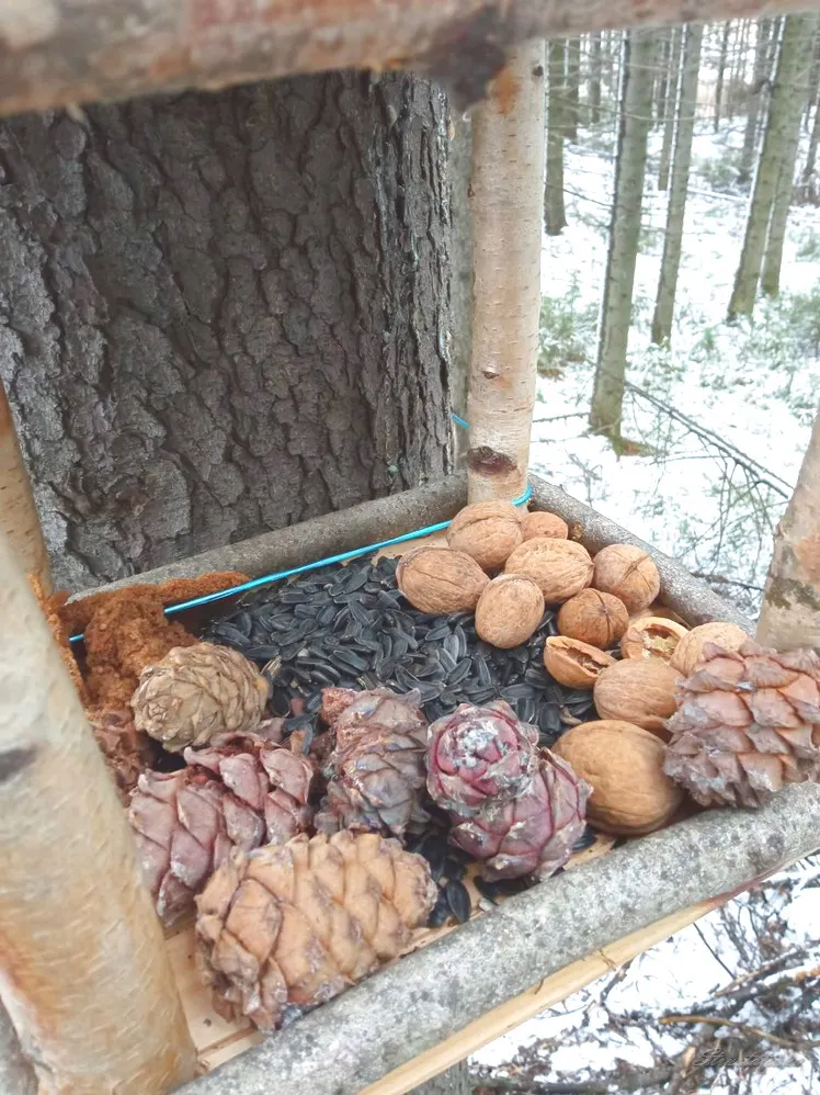 Кормушку заполнили самым популярным кормом для птиц — необжаренными, несолеными подсолнечными семенами, сухарями. Для белок — грецкие орехи. Для дятлов — кедровые целые шишки. Рацион будет периодически меняться, дополняться несоленым салом для синиц, различными семенами злаков.