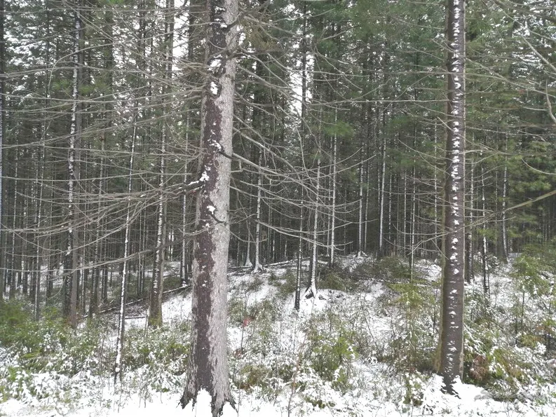 Эта кормушка для птиц была изготовлена из крупных веток упавших деревьев, которых достаточно в таёжном лесу.