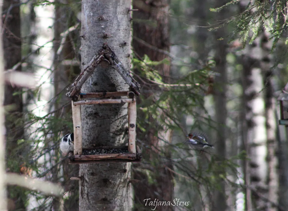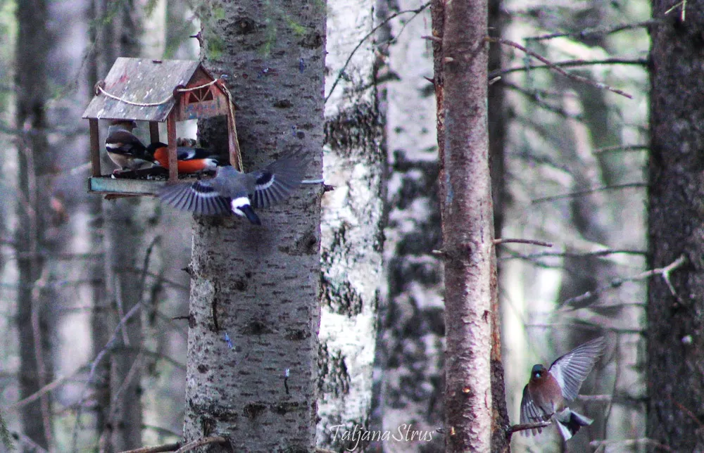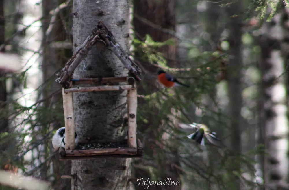 Пришла весна, а вместе с ней закончилось время подкормки лесных птиц. Всю зиму к кормушкам прилетали местные зимующие птицы: поползни, московки, пухляки, дятлы, снегири, чечётки, кедровки, сойки, синицы. Птиц подкармливали семенами подсолнечника, кедровыми орехами, грецкими орехами, кусочками сала и другими полезными для пернатых продуктами питания.