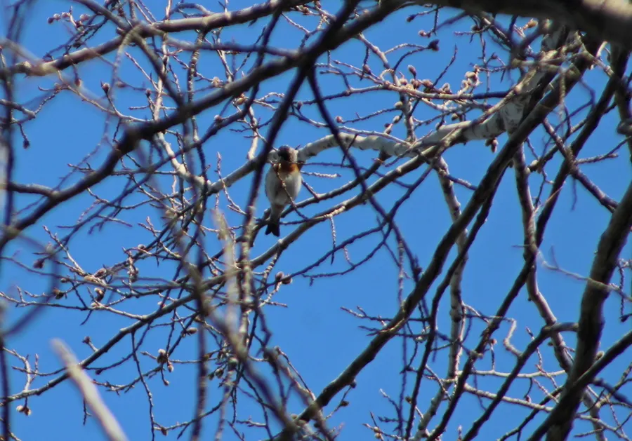 Одновременно с зябликами прилетают юрки, мелкие птички, величиной с воробья, которых сложно рассмотреть среди веток деревьев.