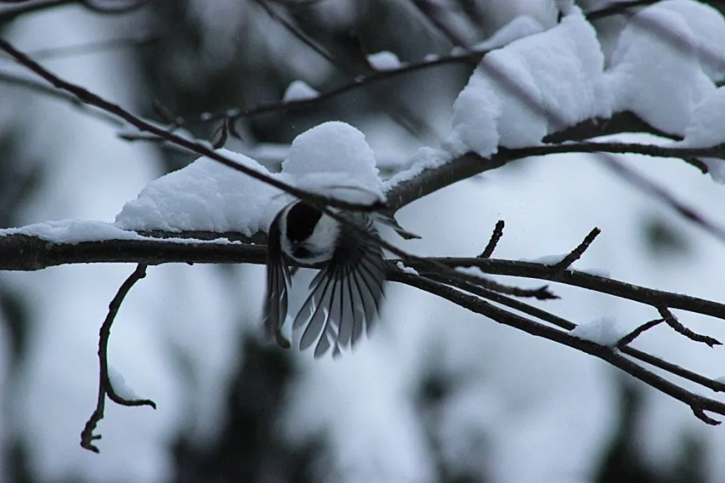 Мелкие птицы леса — гаички, большие синицы, московки и др., — отыскивают корм на нижних ветках деревьев, свободных от снега.