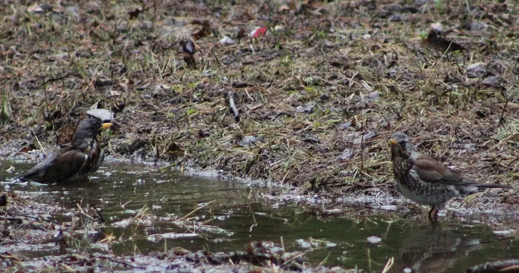 Проследив за удаляющимся объектом, прервавшим их занятие, дрозды вновь начинают наслаждаться купанием в луже, наполненной дождевой водой.