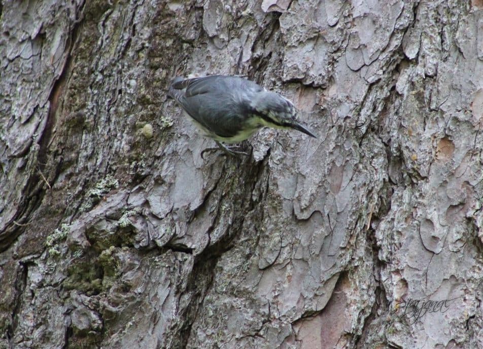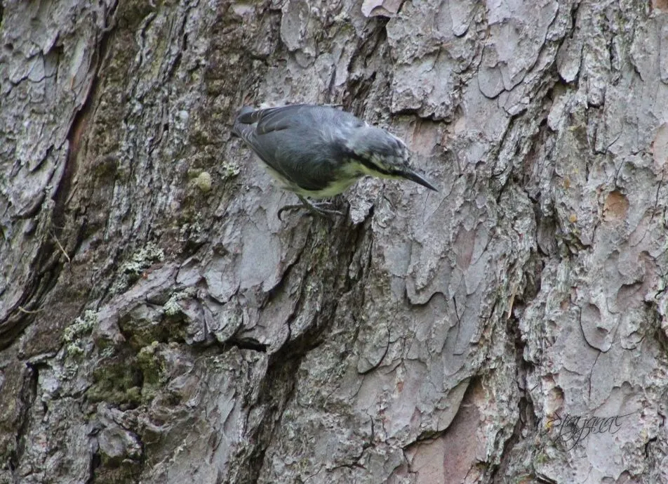 Поползень обыкновенный, с наступлением весенних теплых дней, улетел с мест кормления в лесные дебри и увидеть его удалось только сегодня. Он увлечённо выискивал в коре сосны кедровой насекомых и совсем на обращал на нас внимания.