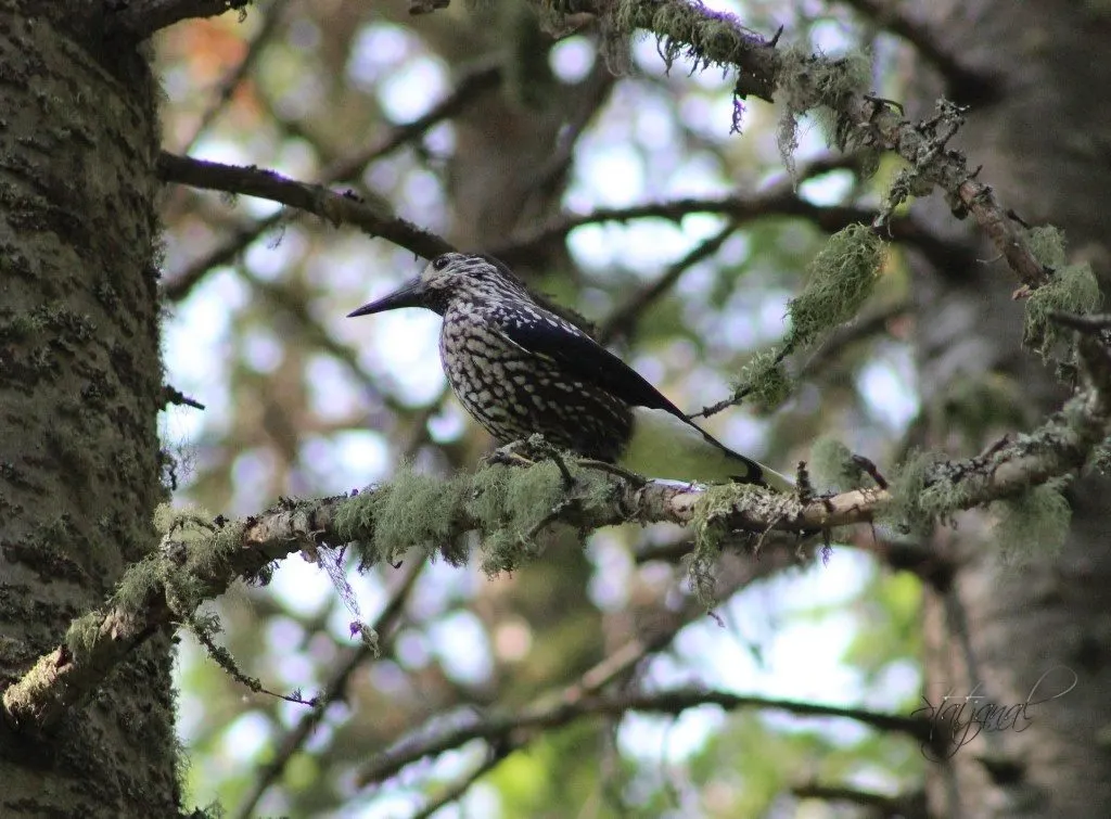 Первой встреченной птицей на тропе стала осторожная, в летний период, кедровка. Кедровка, стремительно лавируя сквозь ветки и стволы деревьев, бесшумно села на поросшую лишайником сухую ветку и стала разглядывать гостей леса.