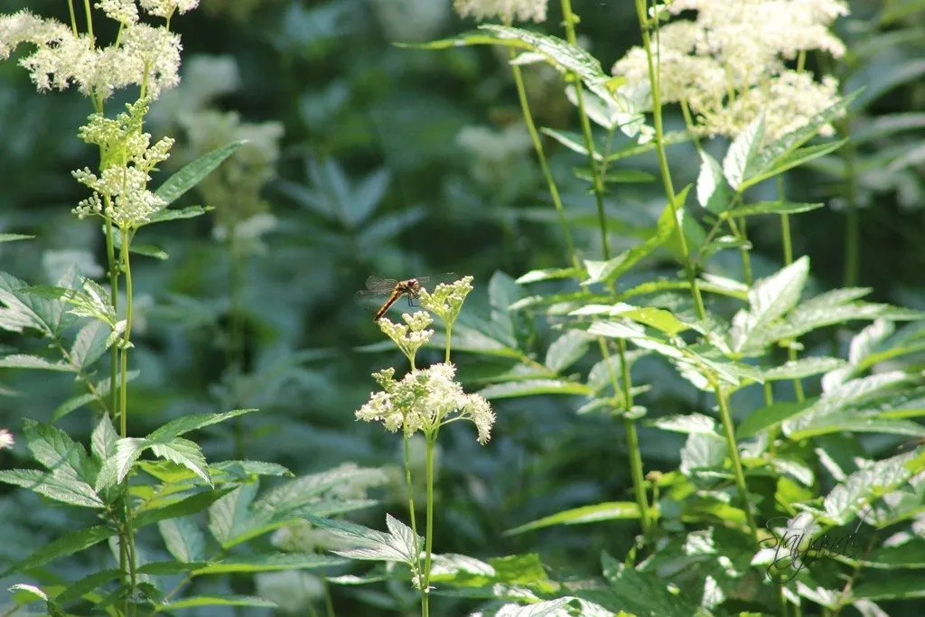 А лето идёт своим чередом. Цветёт лабазник и белые соцветия издают миндальный аромат, который привлекает опылителей. Стрекоза опустилась на соцветие для короткого отдыха.