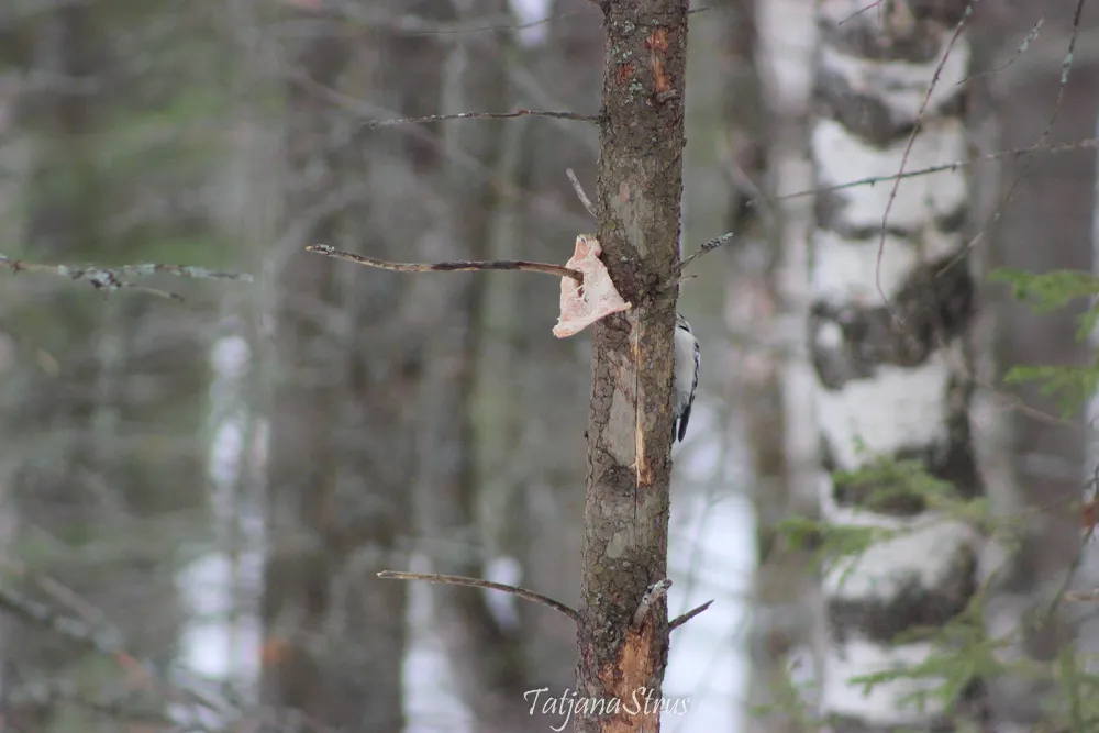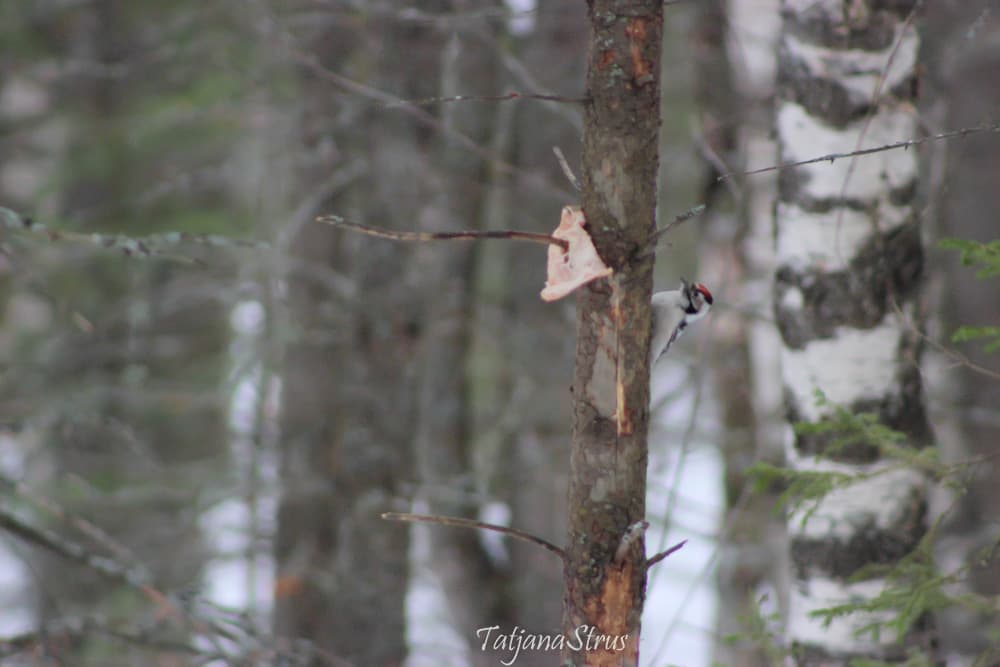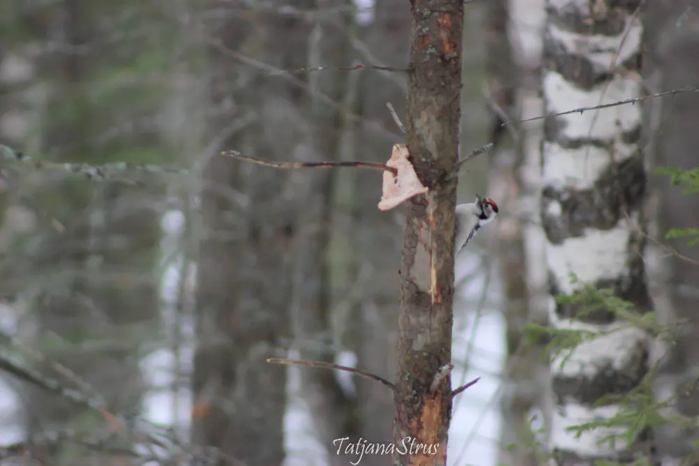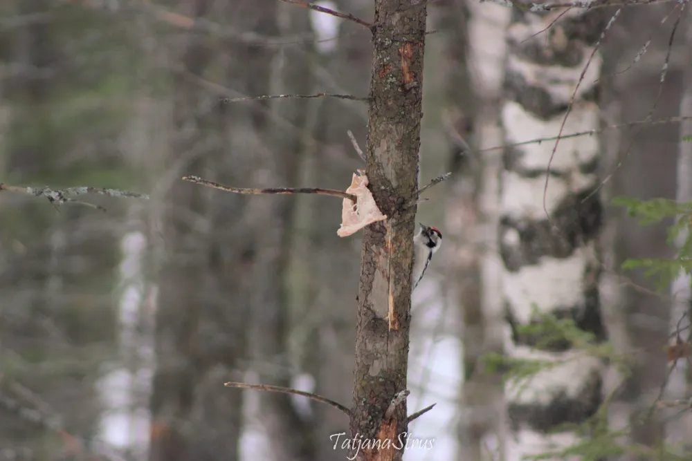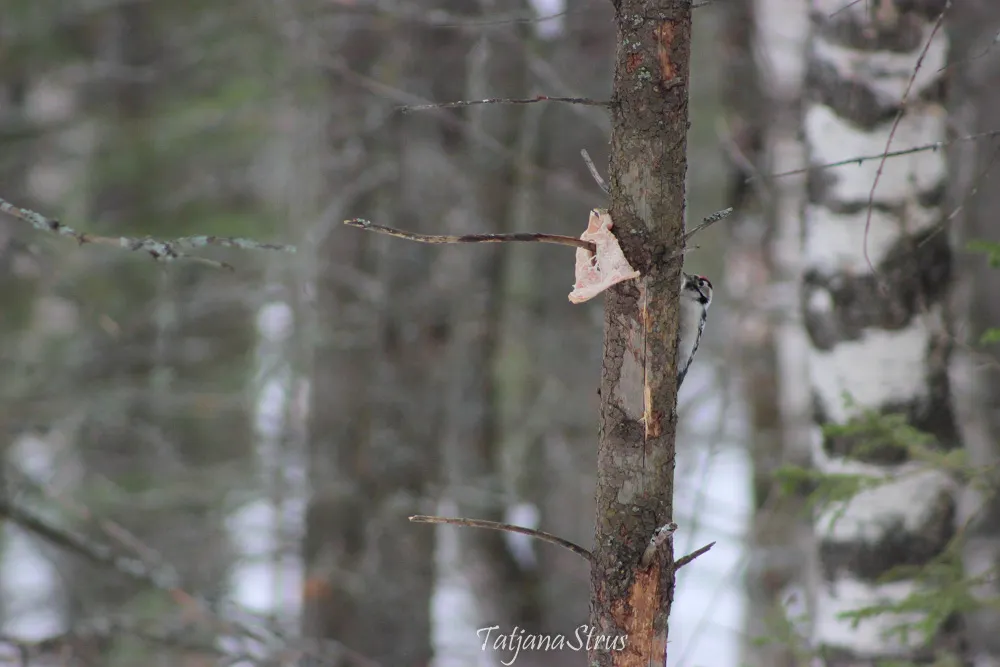 Сегодня в лесу возле кормушки для птиц впервые увидела и сфотографировала малого пёстрого дятла, который увлеченного долбил ствол дерева, иногда выглядывал и мне удавалось сделать фотографию.
