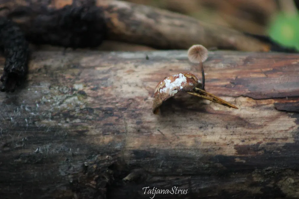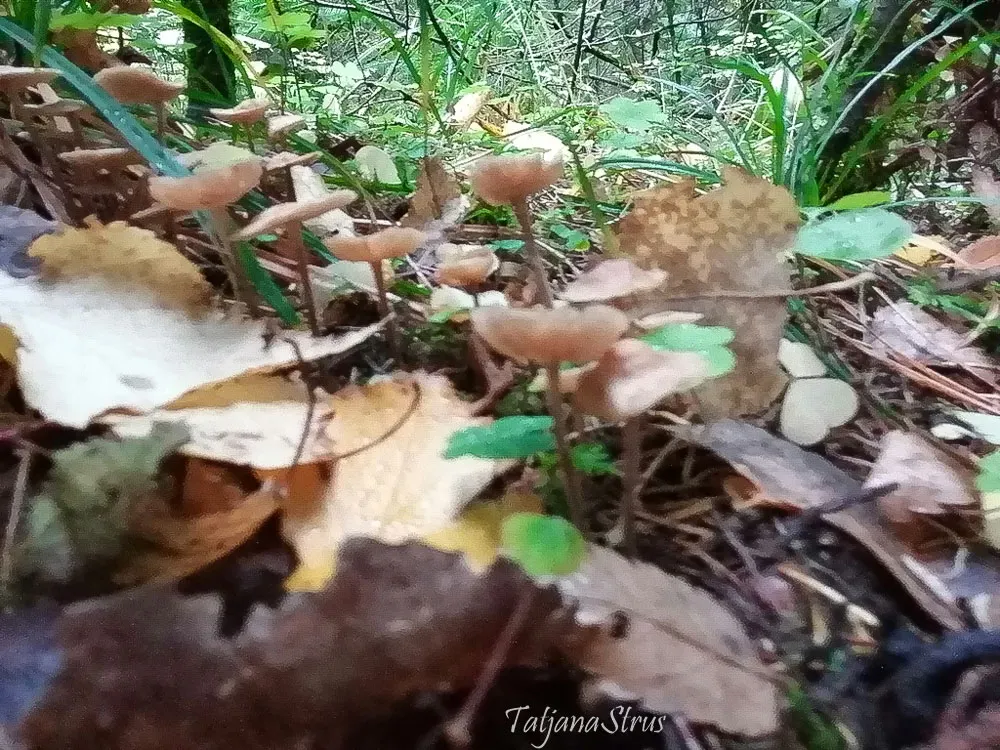 Ножка высотой до 3–3,5 см, толщиной 0,6–1,0 мм, светло-коричневая под шляпкой и далее до темно-коричневого и черного цвета, жесткая, полая, с опушением по всей длине. Пластинки беловатые, кремовые, редкие, свободные или слегка нисходящие на ножку.