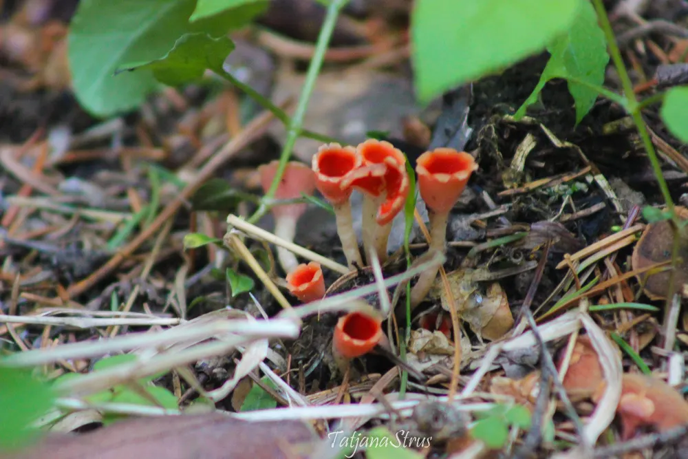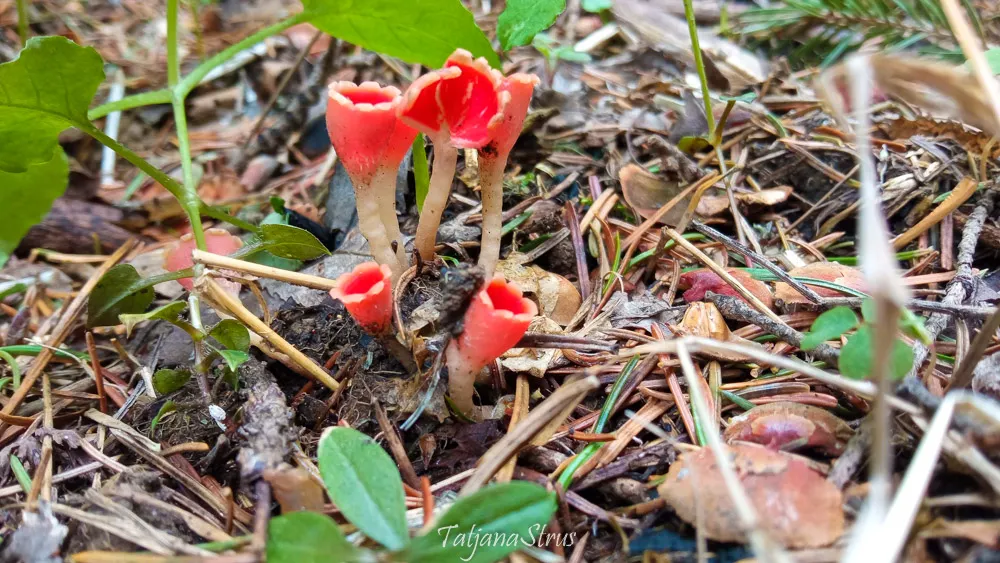 Наконец, сегодня, после многих дней поиска, удалось увидеть микростому вытянутую, её ярко-красные бокаловидные шляпки, похожие на колокольчик с отогнутым краем выделялись на серой земле.