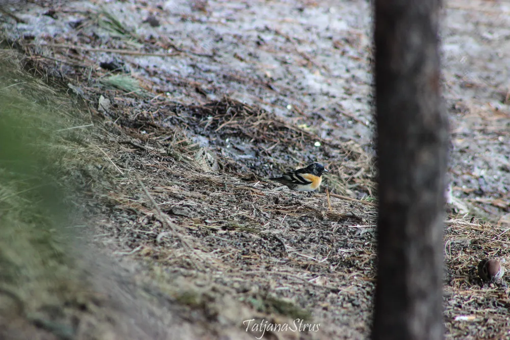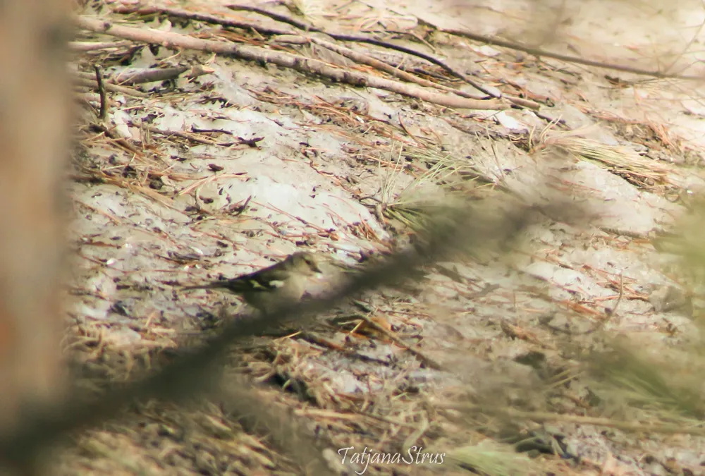 Недавно прилетевший с мест зимовок зяблик (Fringilla coelebs) держался на краю стайки и быстро улетел.