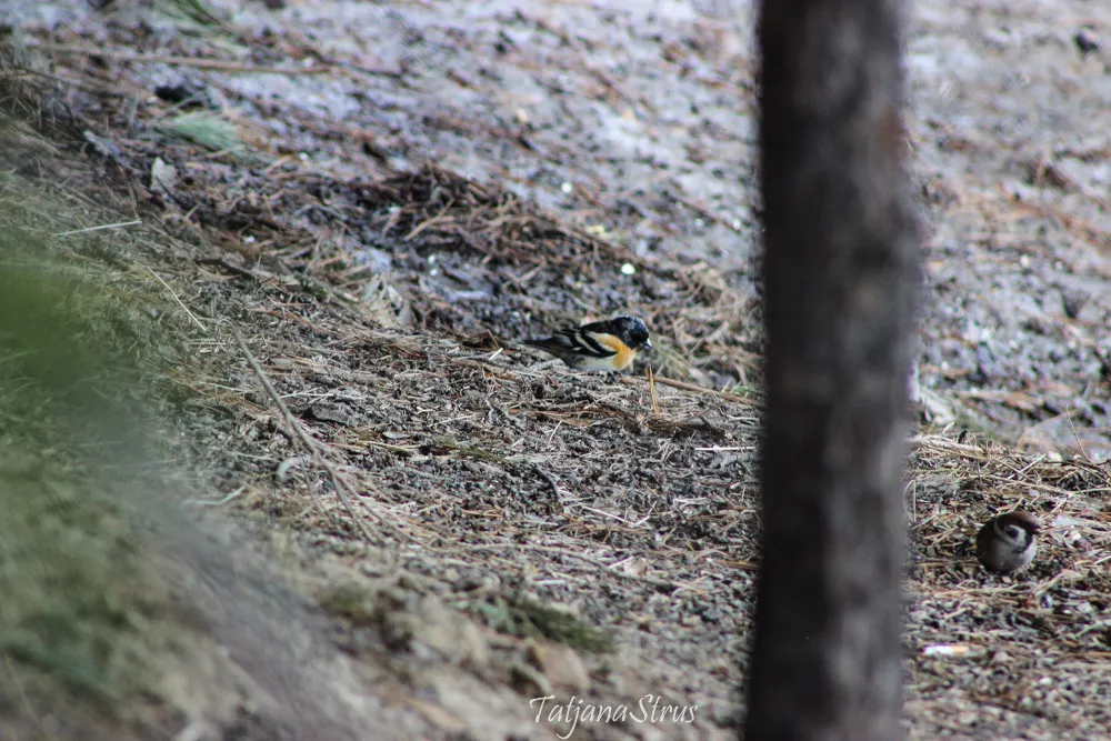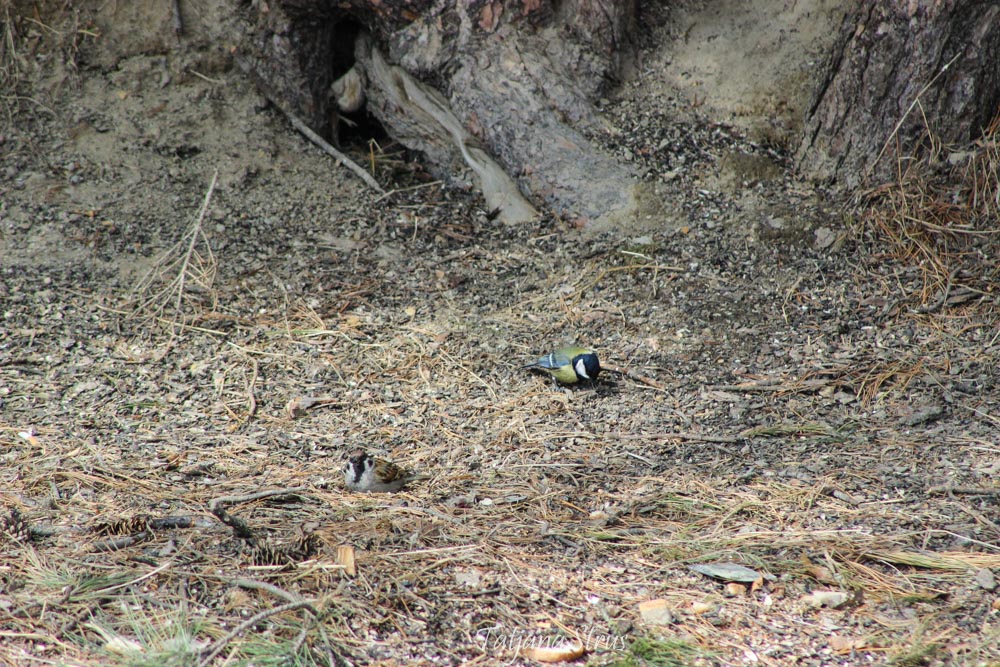 Присматривая друг за другом, грелись на солнце и выискивали съестное перезимовавший полевой воробей (Passer montanus) и, только что, прилетевший на север юрок (Fringilla montifringilla).