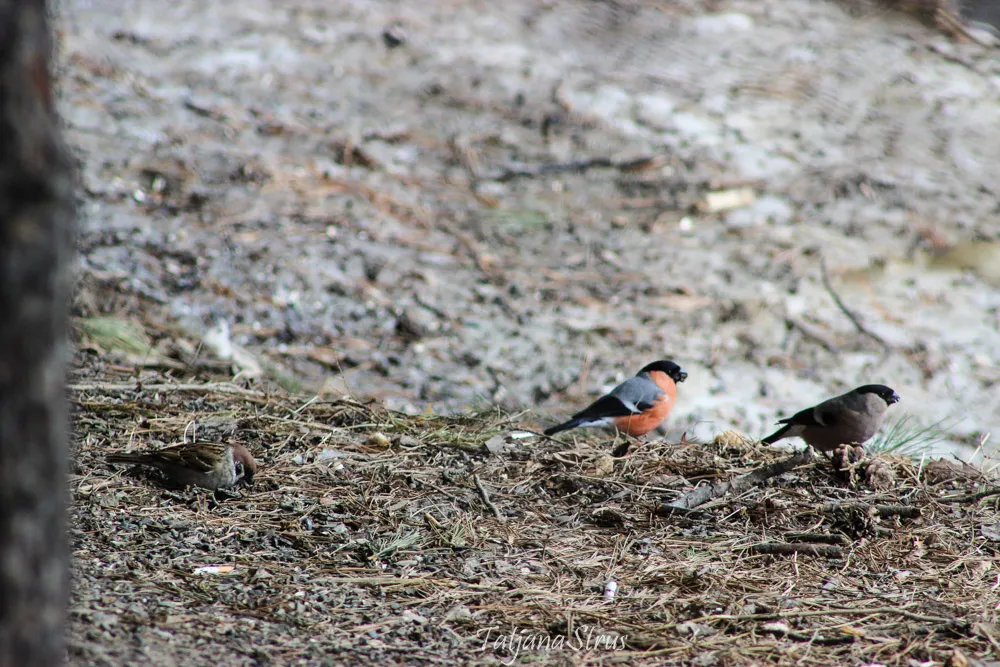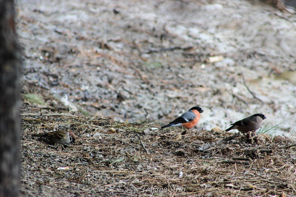 Парочка снегирей (Pyrrhula pyrrhula) кормилась на опушке и не улетала дольше всех. За ними неотвязно следовал полевой воробей, временами опасливо поглядывая на пару.