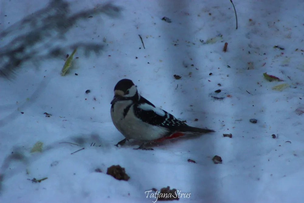 В этом году к кормушкам прилетают не только мелкие по размерам птицы, но и средние, такие, как большой пестрый дятел, который адаптировался к присутствию человека. Из кормушек выбирает кедровые орехи, печенье, мясо, хлеб. Этот дятел очень осторожно ведёт себя в местах прикормок, ежесекундно крутит головой в разные стороны в поисках хищников.