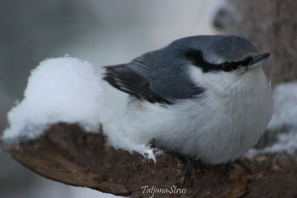 Можно наблюдать, как пухляк склёвывает замерший на морозе хлеб.