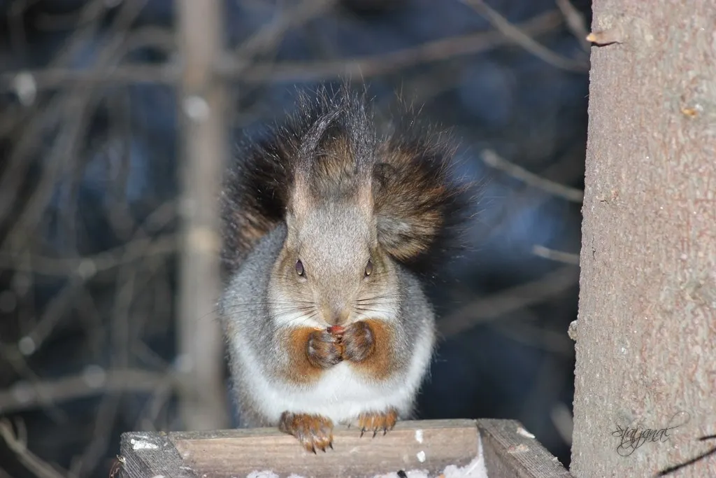 В другой раз особенно раскричался поползень, повторяя непрерывно одни и те же ноты, я оглянулась, но ничего особенного не заметила, пока откуда-то сверху, на перила лестницы, не спрыгнула белка и, не обращая внимания на птиц, взобралась на кормушку.